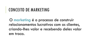 Este documento discute os conceitos e processos de marketing. Ele define marketing como o processo de construir relacionamentos lucrativos com clientes através da criação de valor para eles. Explora os processos de marketing, incluindo entender as necessidades dos clientes, desenvolver uma estratégia de marketing orientada para o cliente e um programa de marketing integrado. Também discute a gestão de relacionamentos com clientes para criar valor e satisfação.