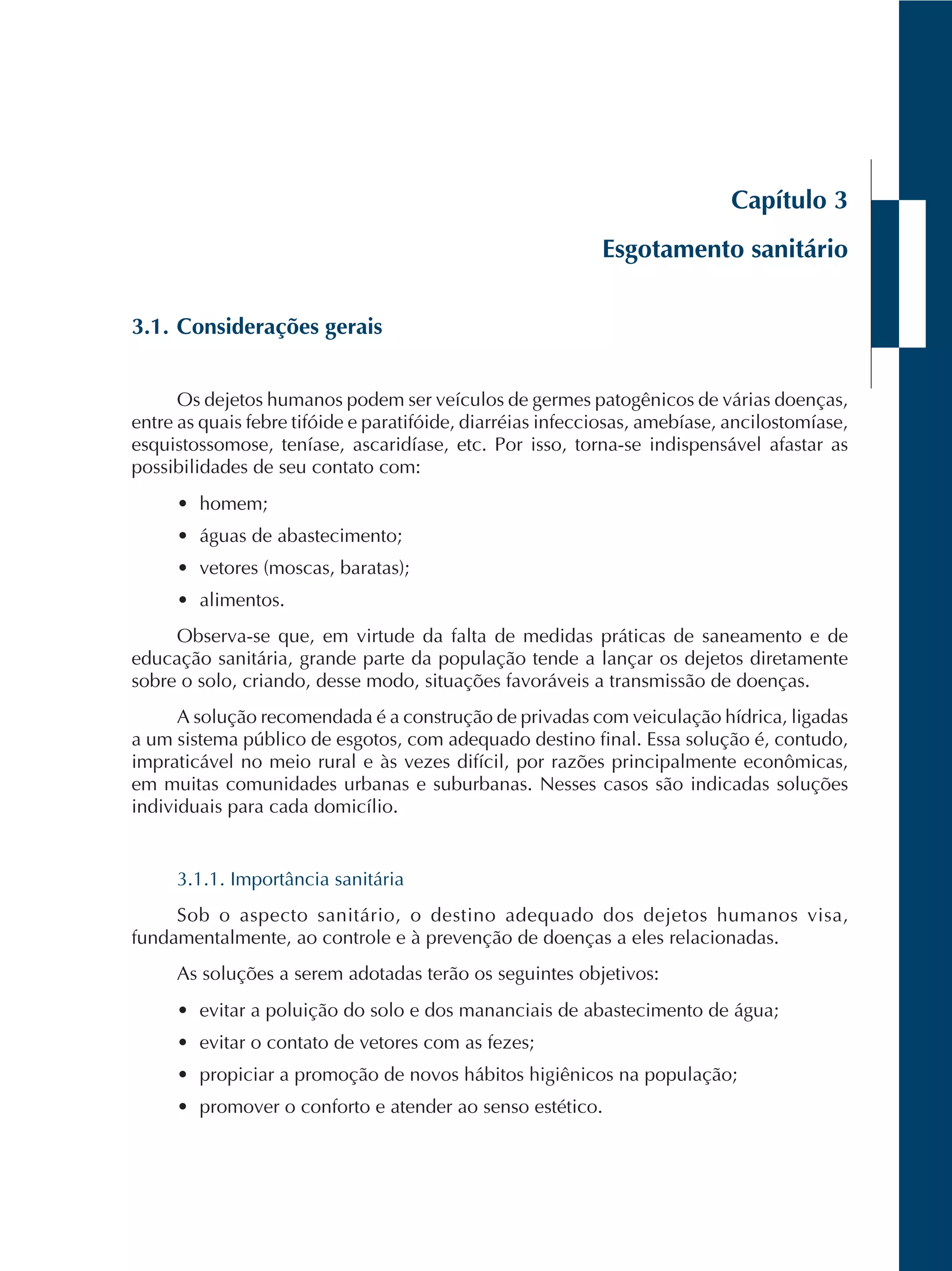 O documento discute esgotamento sanitário e destino adequado de dejetos humanos. Ele explica que os dejetos podem transmitir doenças e devem ser afastados de pessoas, água e alimentos. Também aborda a importância sanitária e econômica do tratamento adequado de esgotos, as características físicas, químicas e biológicas dos esgotos domésticos, e a sobrevivência de bactérias no solo e em águas subterrâneas.