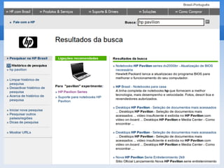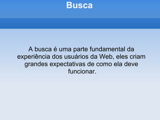 O documento discute as melhores práticas para sistemas de busca em sites web. Ele cobre tópicos como: a importância da busca para os usuários; as expectativas dos usuários em relação à interface de busca; dicas para a página de resultados como classificação e tratamento de resultados vazios; e técnicas de otimização para mecanismos de busca (SEO).