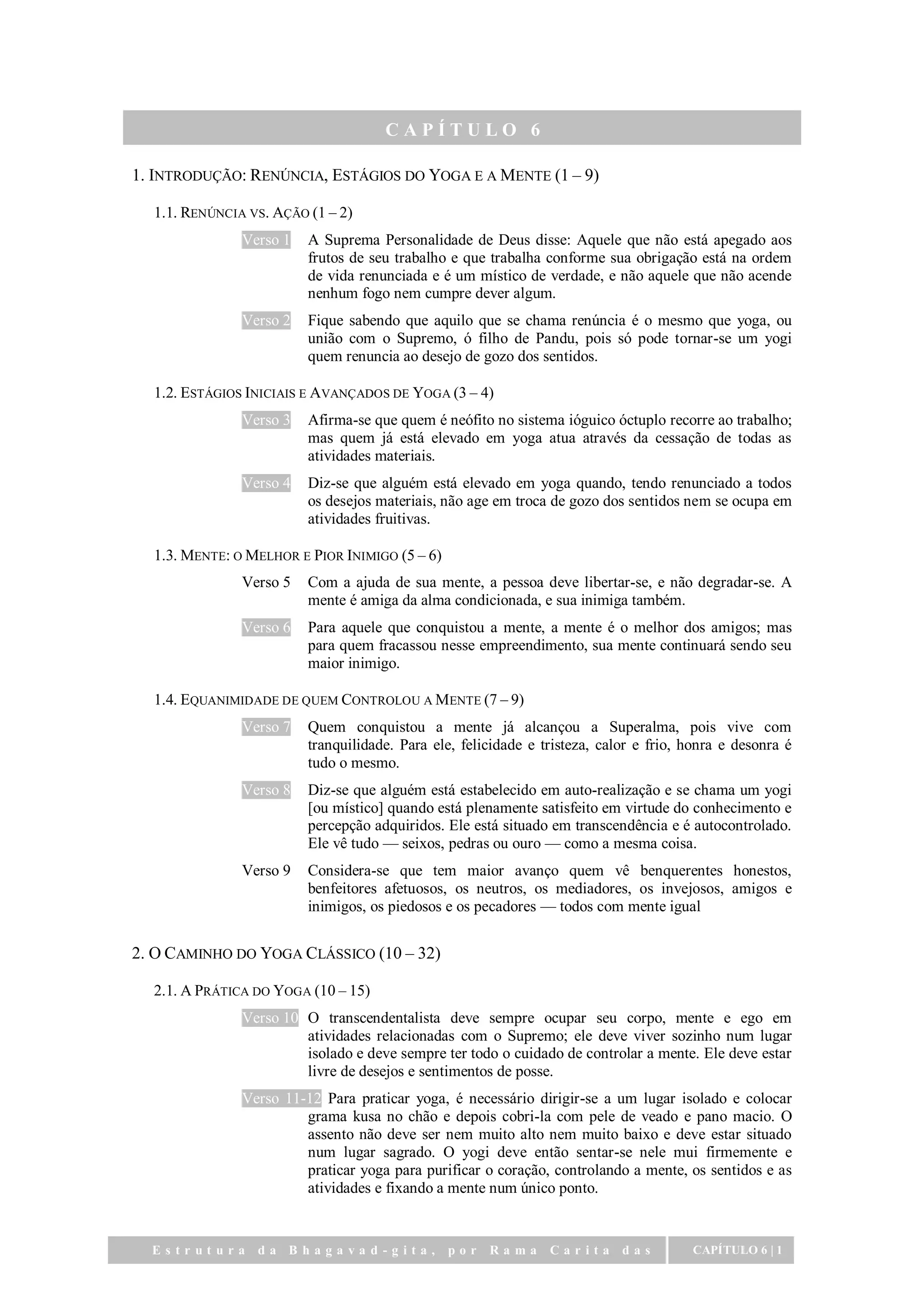 O capítulo descreve os estágios iniciais e avançados do yoga, como controlar a mente, e o destino do yogi mal-sucedido. Arjuna pergunta sobre a dificuldade em controlar a mente e o caminho do yogi que fracassa. Krishna explica que a mente pode ser controlada com prática adequada e desapego, e que o yogi mal-sucedido renasce em família virtuosa e retoma sua prática espiritual.