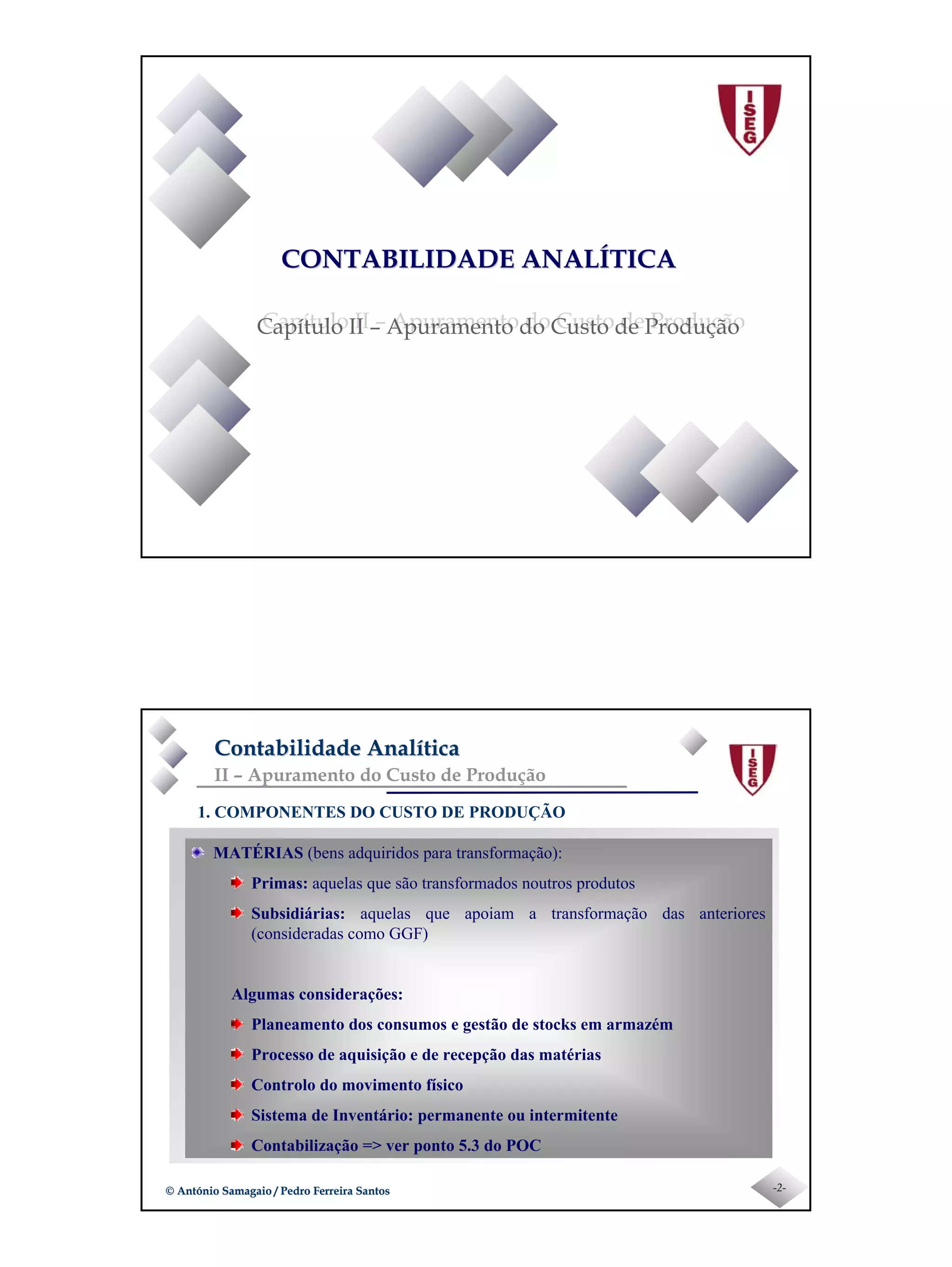 Este documento discute os componentes do custo de produção, incluindo matérias-primas, mão de obra direta e indireta, e gastos gerais de fabrico. Também aborda métodos para alocar gastos gerais de fabrico, como quotas reais e teóricas, e produção conjunta, onde vários produtos são produzidos simultaneamente e os custos devem ser alocados entre eles.
