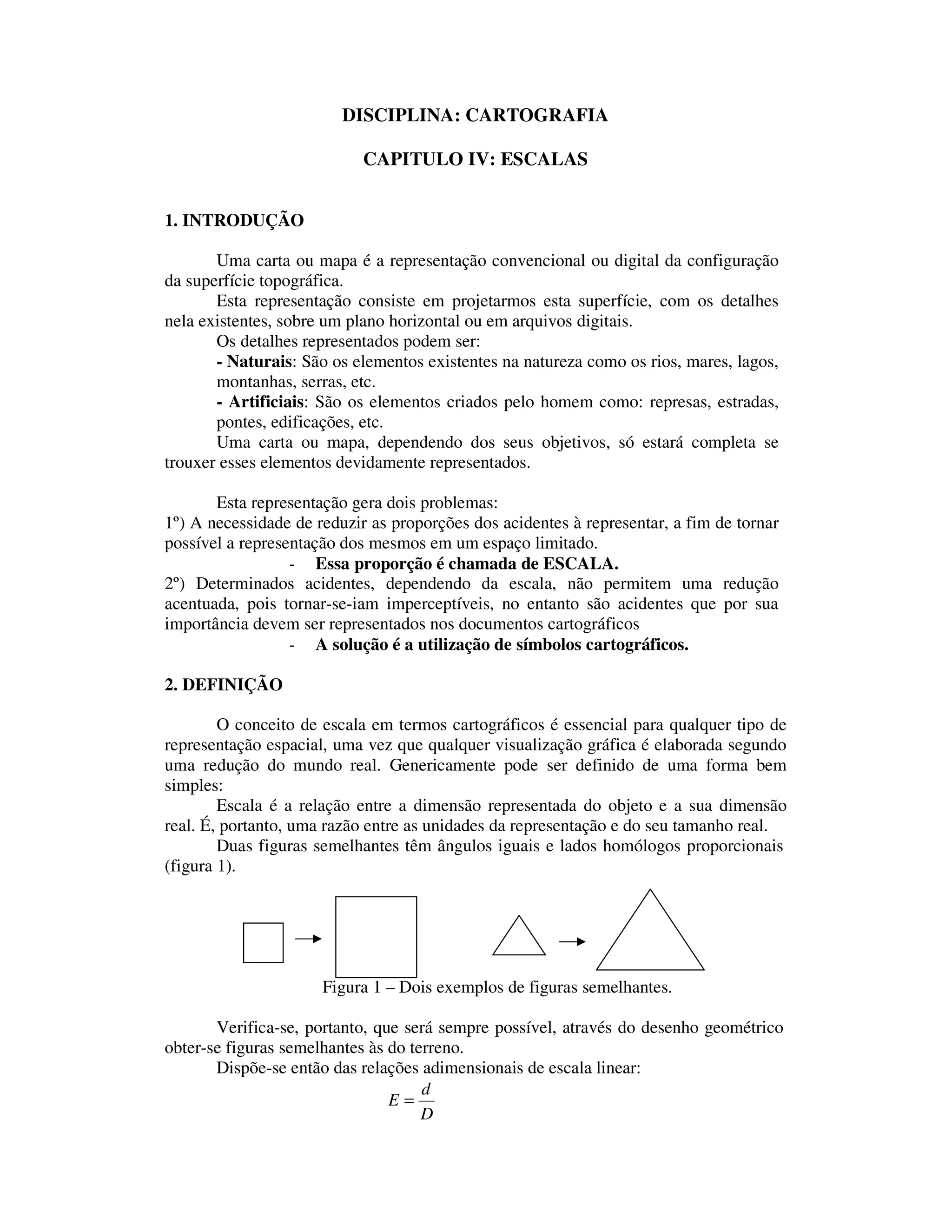 O documento discute escalas em cartografia. Define escala como a relação entre as dimensões representadas de um objeto em um mapa e suas dimensões reais. Explica que quanto menor o número da escala, maior a escala e mais detalhes são mostrados. Detalha os tipos de escala - numérica, gráfica e suas formas de cálculo e construção.