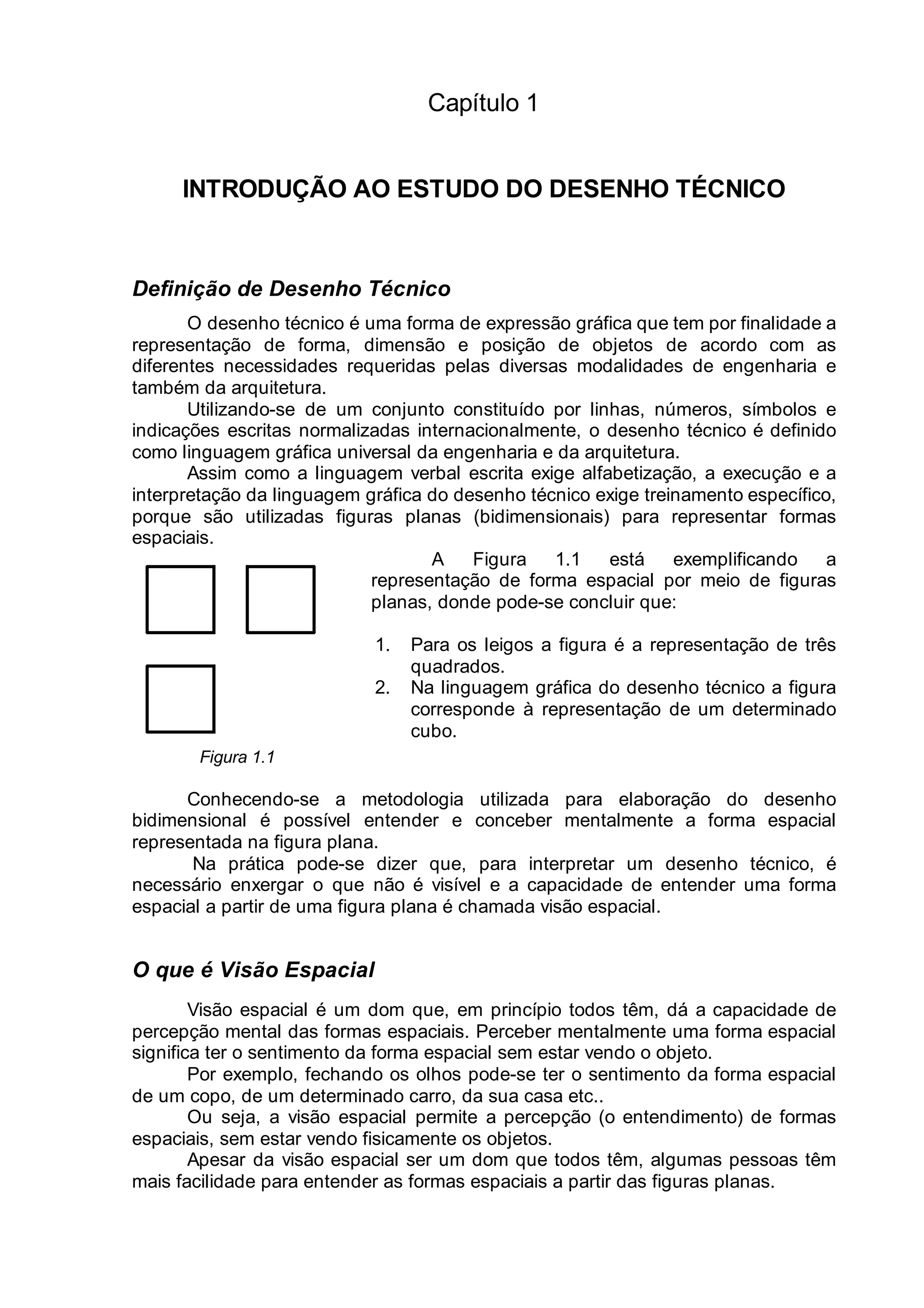 O documento introduz o conceito de desenho técnico, definindo-o como uma forma de expressão gráfica usada para representar objetos de engenharia e arquitetura. Explica que o desenho técnico usa linhas, números e símbolos normalizados para representar formas espaciais em figuras planas, requerendo visão espacial para interpretação. Também descreve a origem e evolução histórica do desenho técnico, os tipos de desenhos, como são elaborados e apresentados, e as normas que regulamentam a padronização