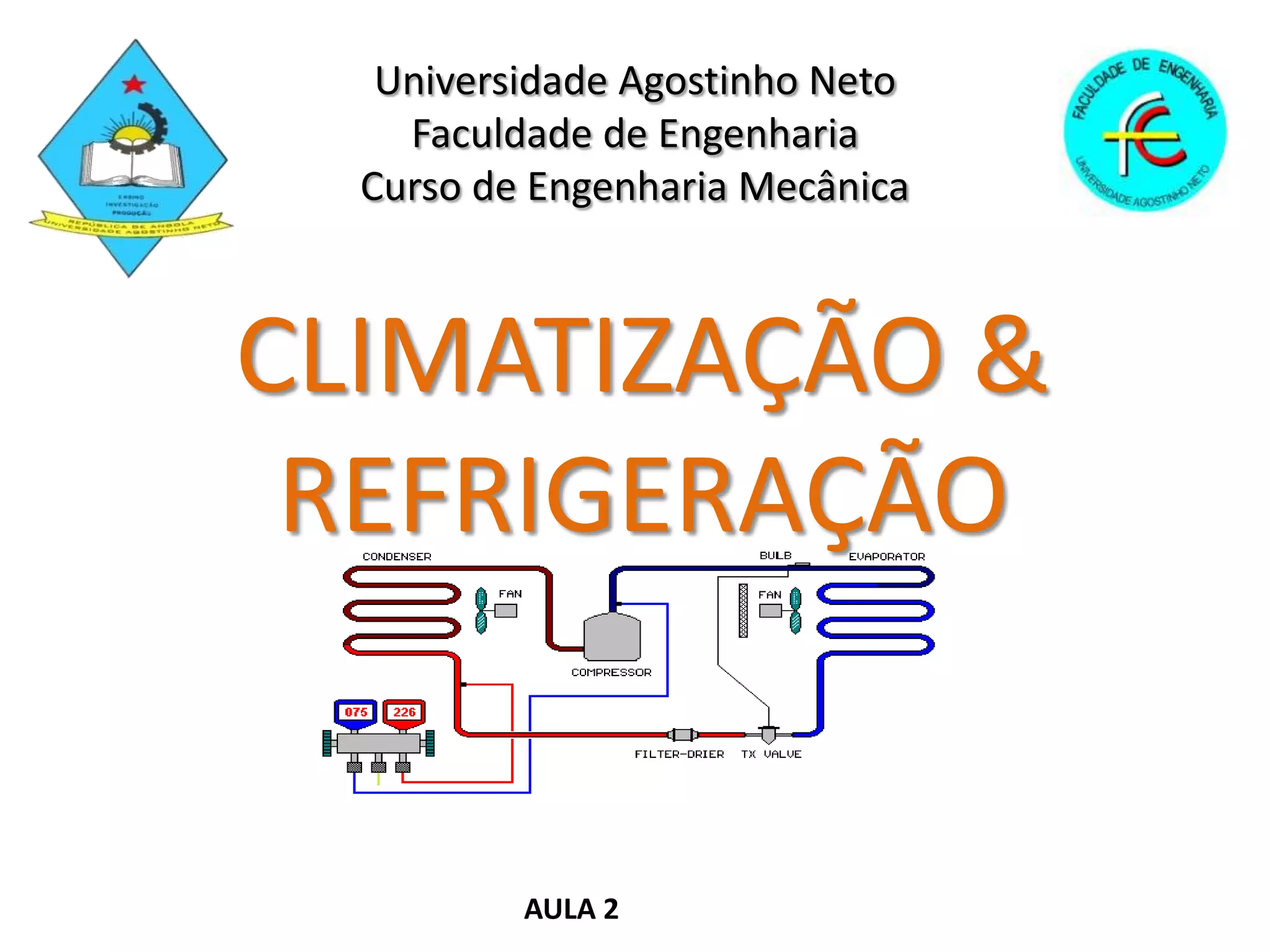 1. O documento apresenta os tópicos a serem abordados na Aula 2 de Climatização e Refrigeração, incluindo a introdução à teoria da refrigeração, métodos para produção de frio, conceitos termodinâmicos fundamentais e formas de transferência de calor.
