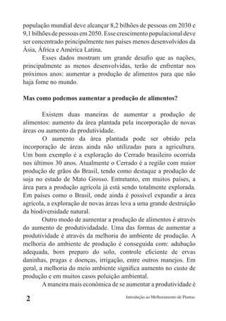 O documento fornece uma introdução ao melhoramento de plantas, discutindo sua importância para a humanidade, objetivos, história e desafios futuros. Ele explica que o melhoramento de plantas tem como objetivo melhorar geneticamente as plantas para beneficiar a humanidade, aumentando a produtividade e qualidade dos alimentos para sustentar a crescente população mundial.