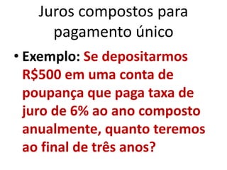O documento discute juros compostos para pagamento único, apresentando exemplos numéricos de cálculo de valor futuro e valor presente usando a fórmula F=P(1+i)n. Também mostra como usar tabelas financeiras para resolver esses problemas de forma alternativa.