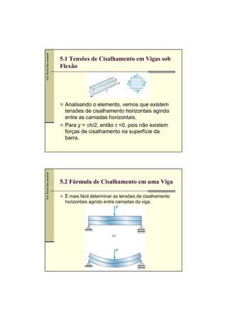 O documento descreve os conceitos de tensões de cisalhamento em vigas sob flexão. Discute as hipóteses básicas, a fórmula de cisalhamento e a distribuição das tensões de cisalhamento em seções retangulares e circulares. Também apresenta exemplos numéricos de dimensionamento de seções sob tensões de cisalhamento e flexão.