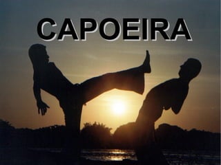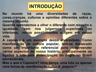Este documento apresenta um plano de aula sobre capoeira para alunos do ensino fundamental. O documento introduz o tema da capoeira, divide a turma em sete grupos para pesquisas sobre diferentes aspectos da capoeira, fornece recursos para a pesquisa, critérios de avaliação e conclusões sobre a capoeira como manifestação cultural.