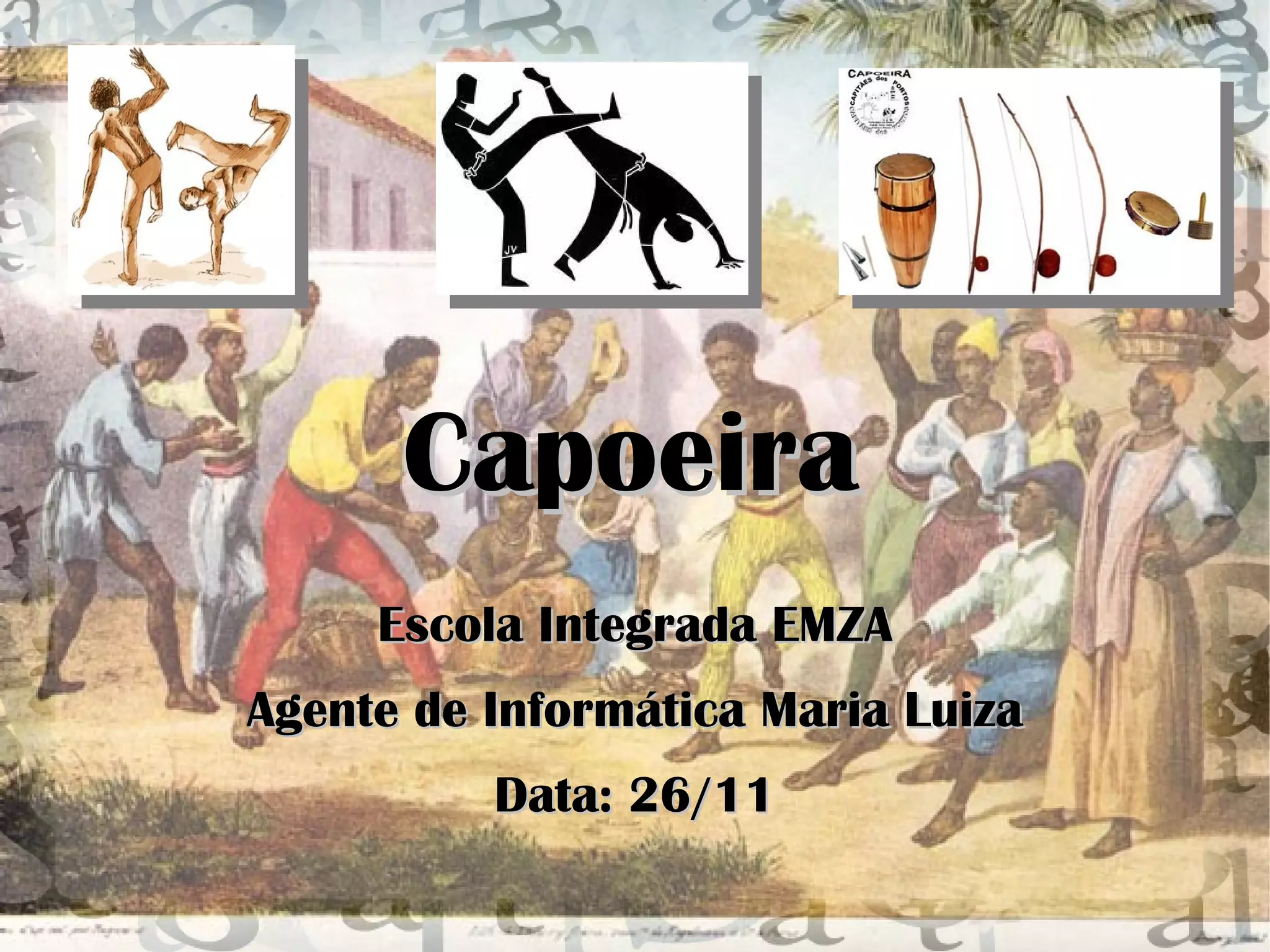 O documento descreve a origem e a história da capoeira no Brasil. Explica que a capoeira começou como uma forma de luta e resistência dos escravos africanos e foi proibida por muito tempo, mas hoje é reconhecida como uma arte marcial e forma de expressão cultural brasileira.