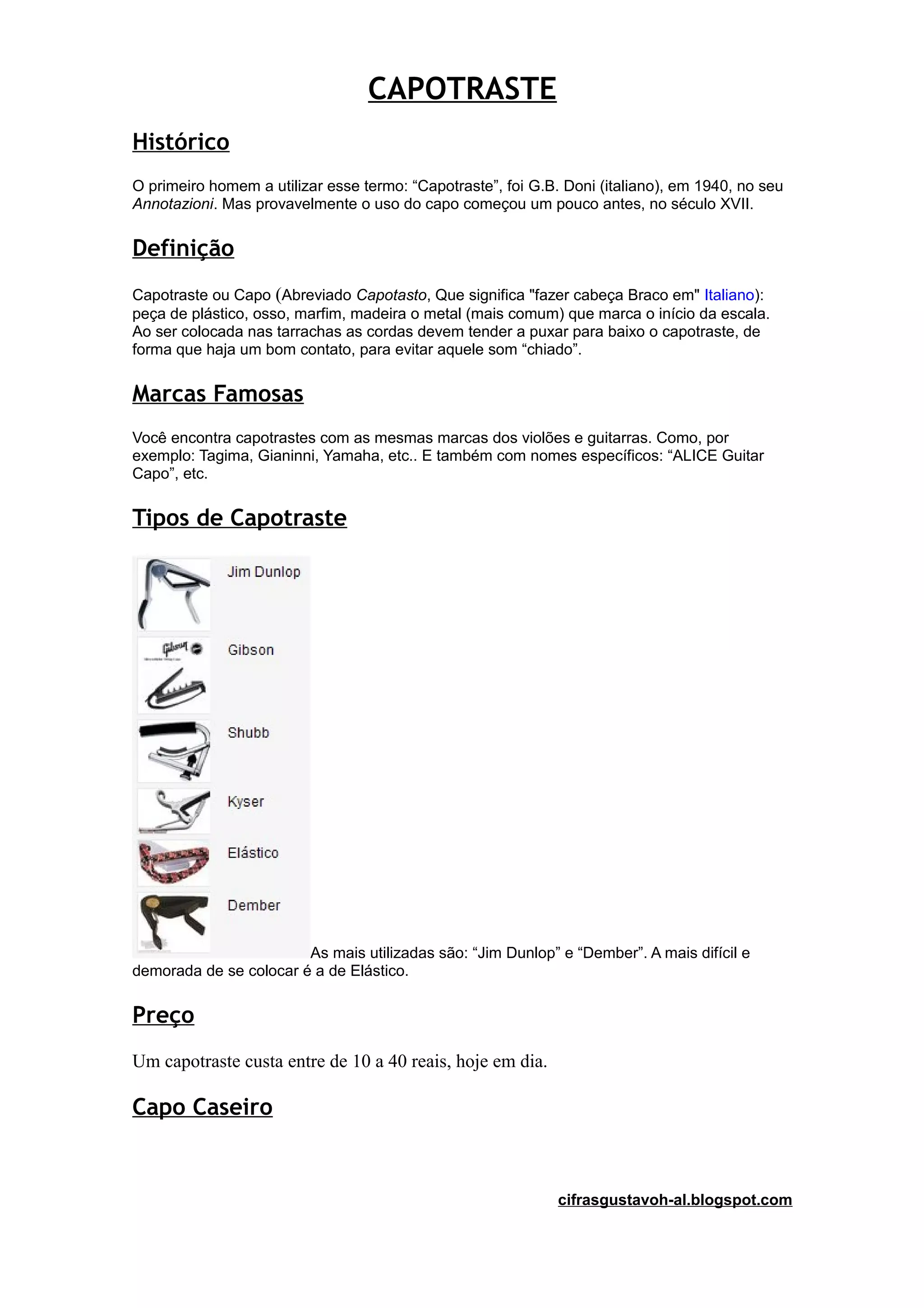 O capotraste é uma peça colocada no braço de violões e guitarras que marca o início da escala e permite tocar acordes em posições mais altas como se fossem na primeira posição, facilitando a execução de músicas. Os capotrastes mais comuns são feitos de plástico, osso, madeira ou metal e custam entre 10 a 40 reais, podendo ser comprados com marcas famosas ou feitos em casa com lápis e elástico.