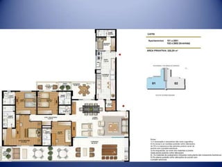 O empreendimento residencial consiste em uma torre de 30 andares com 30 apartamentos de 271,61m², cada um com sala, varanda, quatro suítes e diversas comodidades como brinquedoteca e spa. A estrutura inclui elevadores social e de serviço, além de áreas técnicas para ar condicionado. As unidades possuem layout completo com áreas de serviço e varandas, e estão disponíveis para visitação.