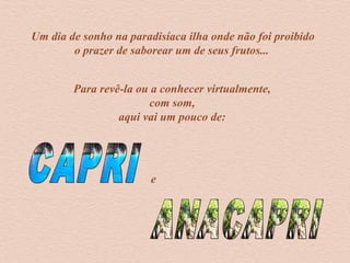 O documento descreve uma viagem de um dia para a ilha de Capri na Itália, começando com a chegada de barco e explorando locais como a Grotta Azzurra, Anacapri, Villa San Michele e Marina Piccola, apreciando as belas paisagens e cultura local.