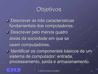 O documento introduz conceitos fundamentais sobre computadores, incluindo suas características, componentes e áreas de aplicação na sociedade. Ele descreve as diferenças entre dados e informações, a importância das redes e da internet, e classifica diversos tipos de computadores. O texto também aborda a interação entre hardware, software e usuários, que são essenciais para o funcionamento dos sistemas computacionais.