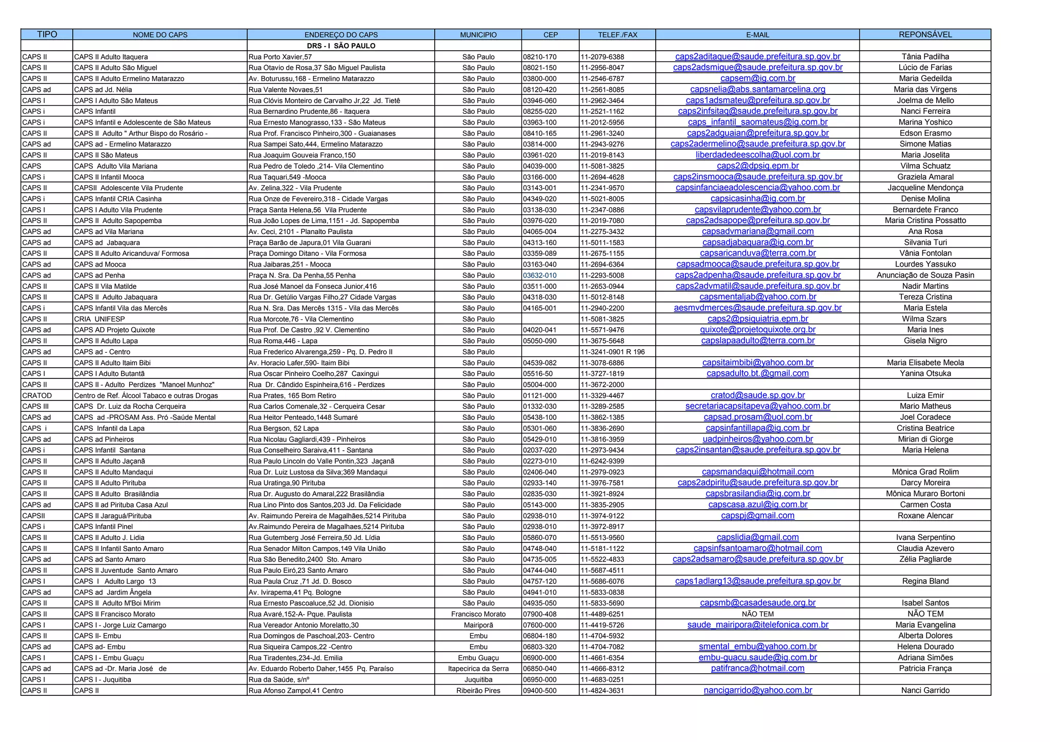 Este documento fornece uma lista de Centros de Atenção Psicossocial (CAPS) na cidade de São Paulo, incluindo o tipo, nome, endereço, município, telefone e responsável de cada um. São listados mais de 50 CAPS que oferecem atendimento para adultos, crianças, adolescentes e dependentes químicos em diversas regiões da cidade.