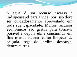 O documento discute os benefícios da captação e reuso da água da chuva, incluindo a redução do consumo de água potável, economia financeira e prevenção de enchentes. Ele também descreve os principais componentes de um sistema de captação, como a cisterna dimensionada de acordo com o volume de água coletado e reutilizado, e os cuidados necessários para garantir a não contaminação da água.