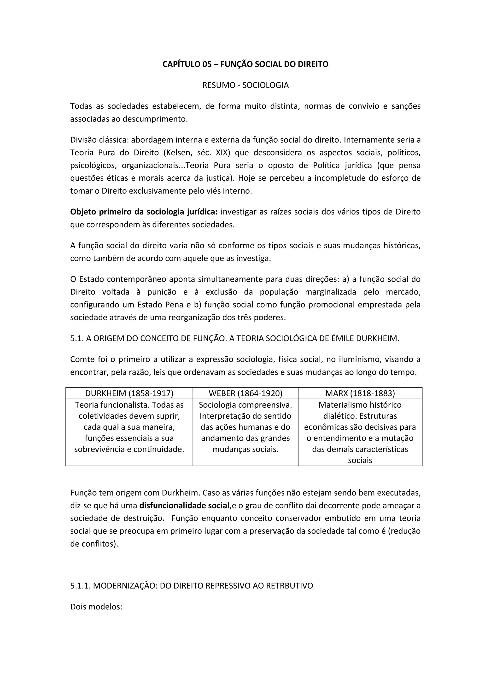 O documento discute a teoria funcionalista do sociólogo Émile Durkheim sobre a função social do direito. De acordo com Durkheim, o direito tem a função de preservar a ordem social e minimizar conflitos. Ele diferencia as funções do direito em sociedades tradicionais e modernas. O documento também aborda as visões de Marx, que criticou o direito moderno por legitimar desigualdades sociais por meio de uma igualdade formal.