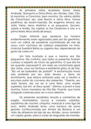 O documento descreve o nascimento de uma menina chamada Maria Aline em uma cidadezinha no interior de Pernambuco no século 20. Ela nasceu saudável e recebeu visitas de amigos e familiares da região. Crescia rechonchuda e saudável, sendo cuidada por sua mãe e ama-de-leite. A cidade tinha poucos habitantes e entretenimento, com reuniões nas calçadas à noite para conversar e ouvir o rádio.