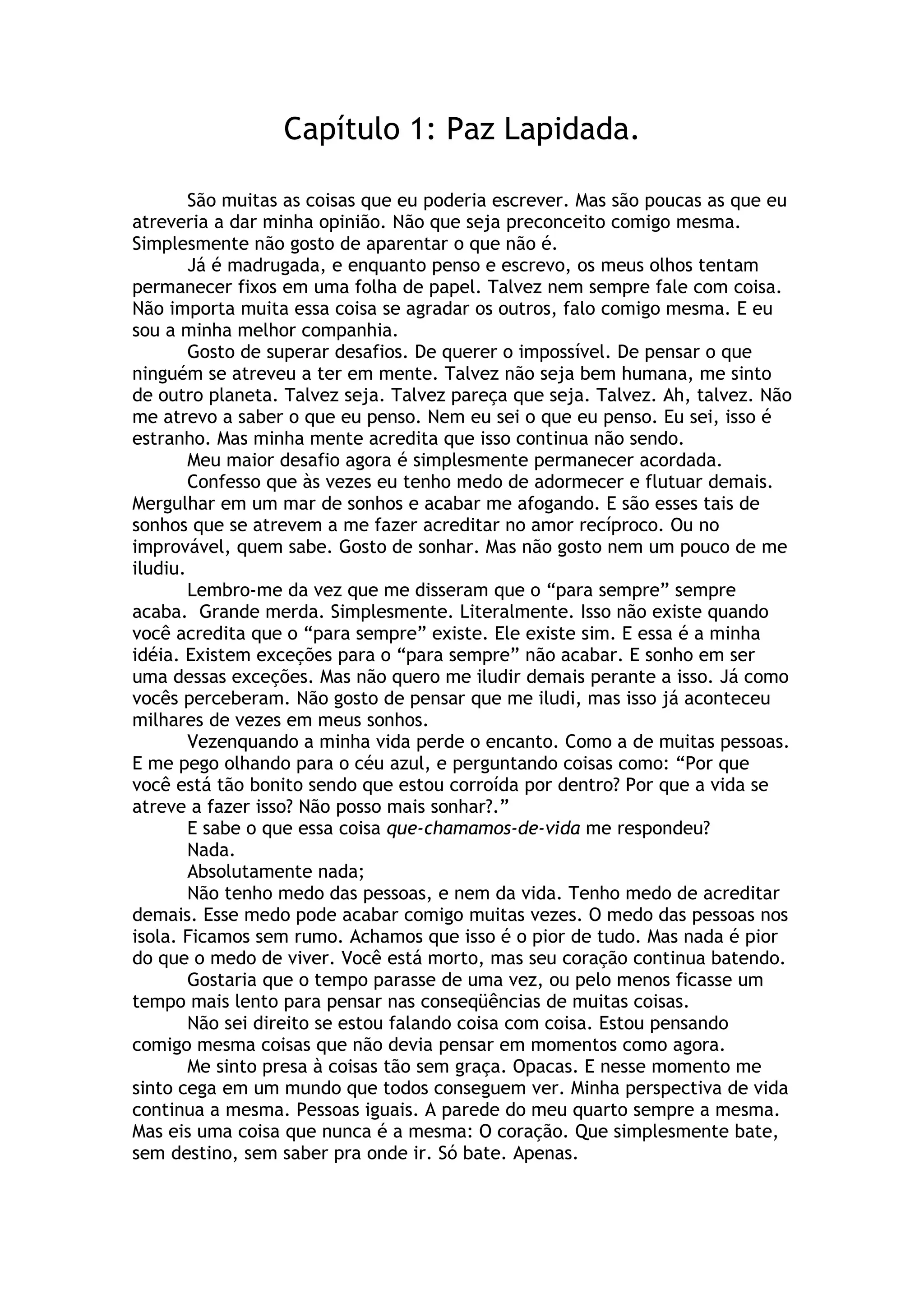 Este capítulo explora os sentimentos de incerteza, medo e ilusão da autora. Ela reflete sobre sonhar alto demais e sobre como a vida pode desiludir, deixando-nos com dúvidas sobre nós mesmos e sobre o futuro. A autora também expressa seu desejo de entender melhor seus próprios sentimentos complexos.
