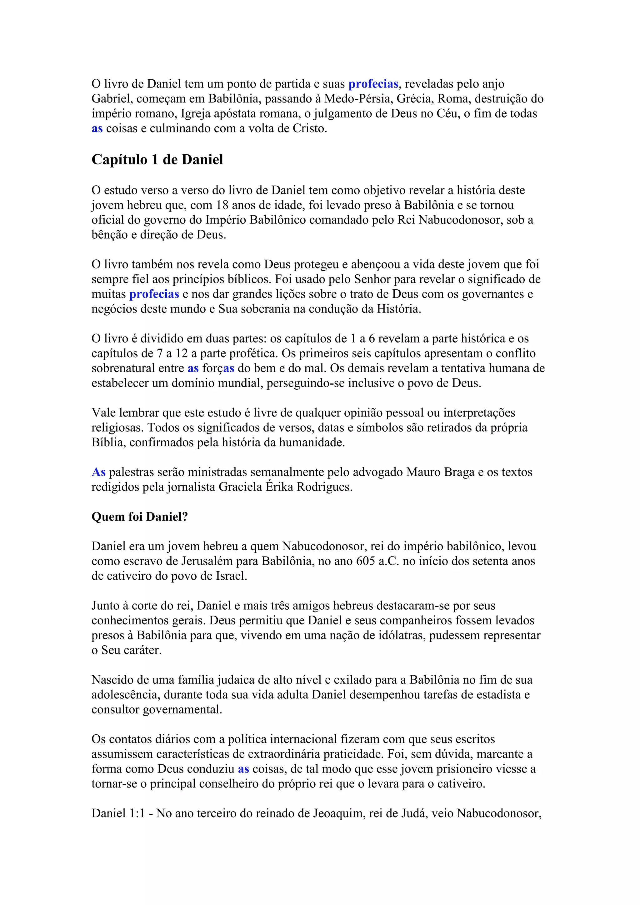 O documento descreve a história de Daniel, um jovem hebreu levado cativo para a Babilônia no século VI a.C. Daniel manteve sua fé em Deus ao recusar alimentos e bebidas pagãs, o que agradou a Deus. Ele e seus companheiros foram abençoados com sabedoria e passaram a ocupar cargos no governo babilônico, servindo como exemplo de fidelidade a Deus mesmo em terra estrangeira.