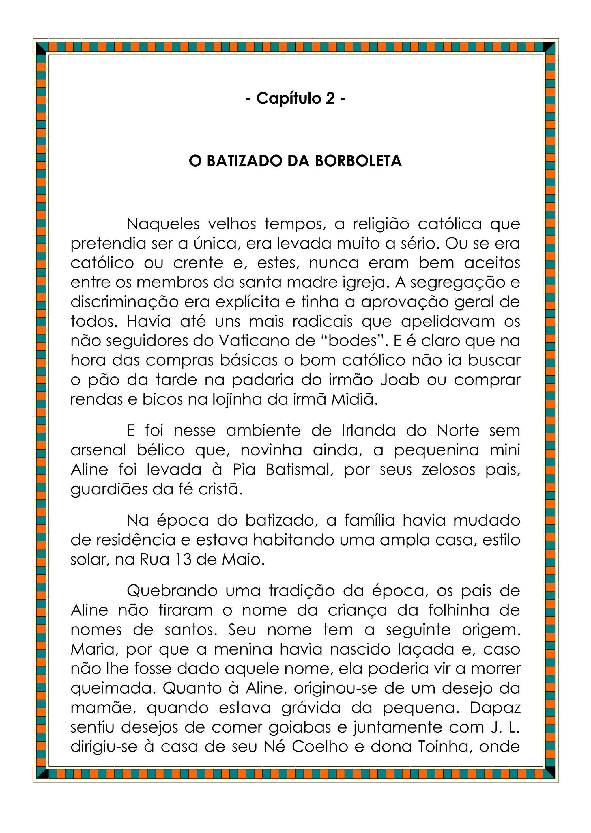 O documento descreve o batizado de uma menina chamada Aline no interior do Brasil na época da Igreja Católica. Detalha a festa de batizado com muitos convidados e comidas típicas. Uma benzedeira local deu previsões sobre o futuro da menina, dizendo que ela seria inteligente mas baixinha.