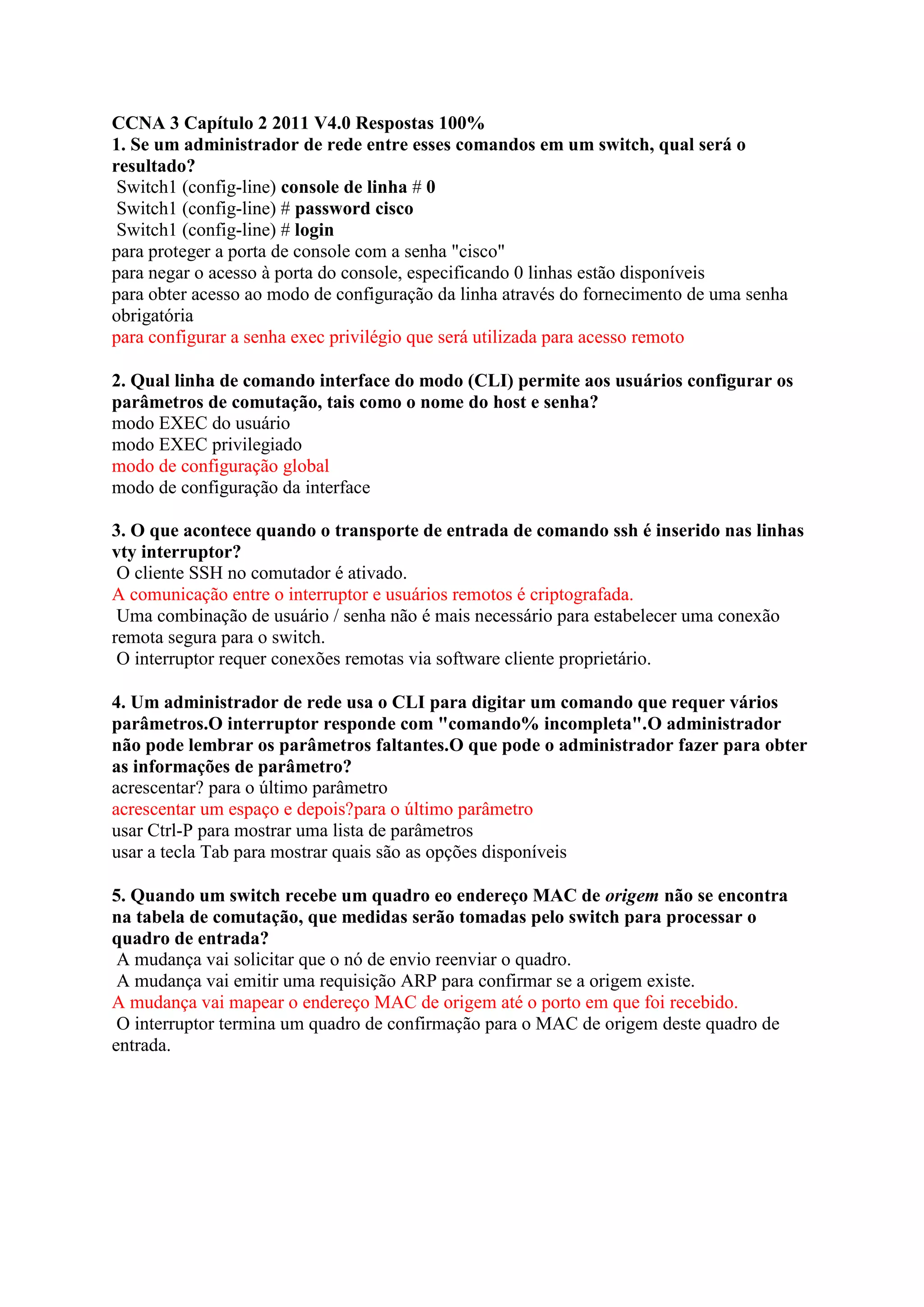 O documento contém 20 perguntas e respostas sobre CCNA 3 Capítulo 2. As perguntas cobrem tópicos como configuração de linha de comando no switch, modo de configuração, autenticação remota, processamento de quadros desconhecidos, full-duplex, segurança de senha e porta, domínios de colisão e broadcast.