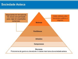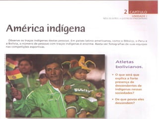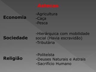O documento descreve as civilizações indígenas da América, incluindo os astecas, maias e incas. Detalha suas economias baseadas na agricultura, caça e pesca, suas sociedades hierárquicas e religiões politeístas que enfatizavam deuses naturais e astrais e realizavam sacrifícios humanos e de animais. Também fornece um quadro comparativo destas culturas.