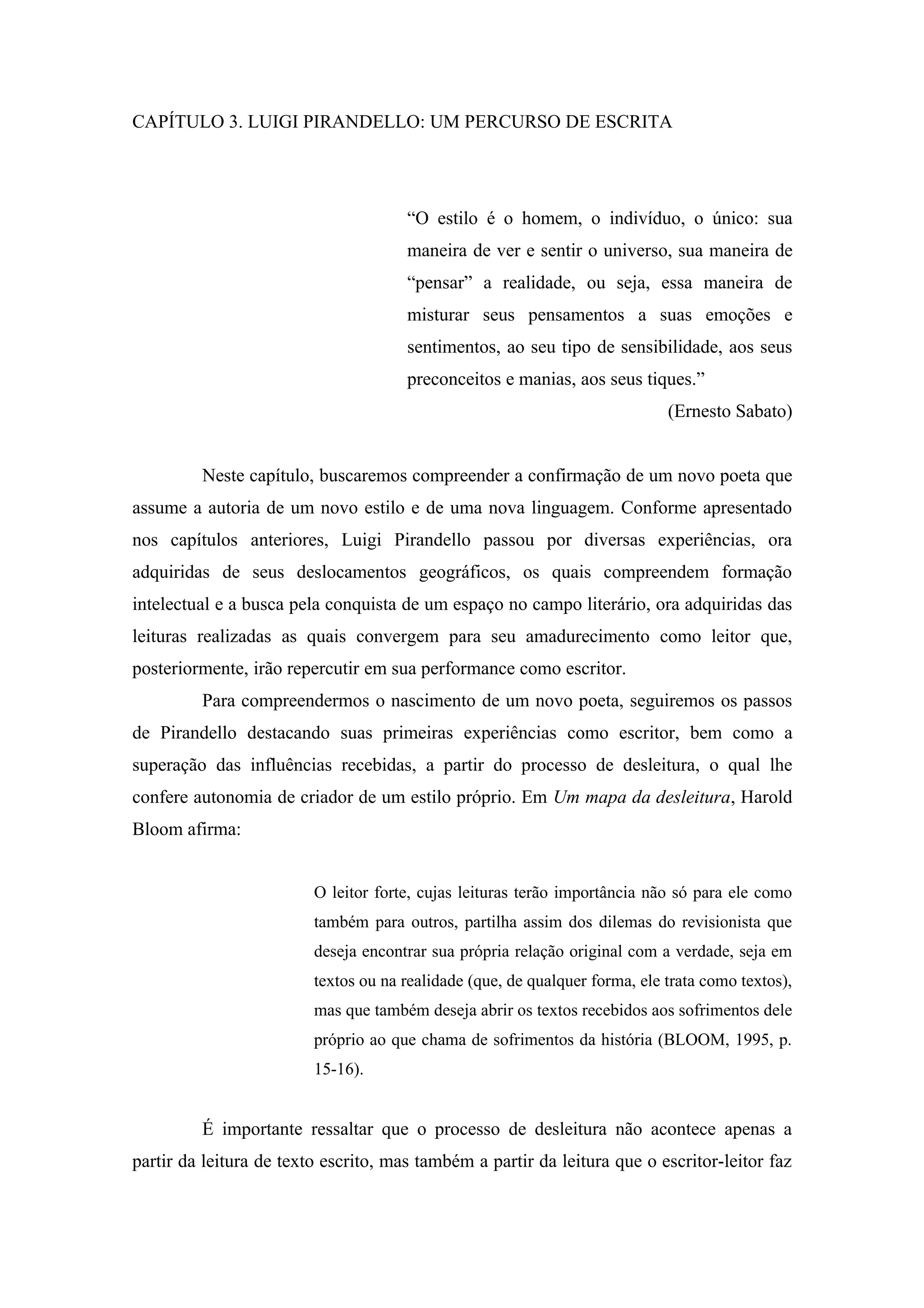 O capítulo analisa o percurso de escrita de Luigi Pirandello, desde suas primeiras experiências até a maturação de seu estilo único. Destaca as influências iniciais, o processo de desleitura que o levou à autonomia criativa e a temática recorrente da fragmentação da identidade no homem moderno presente em toda sua obra.