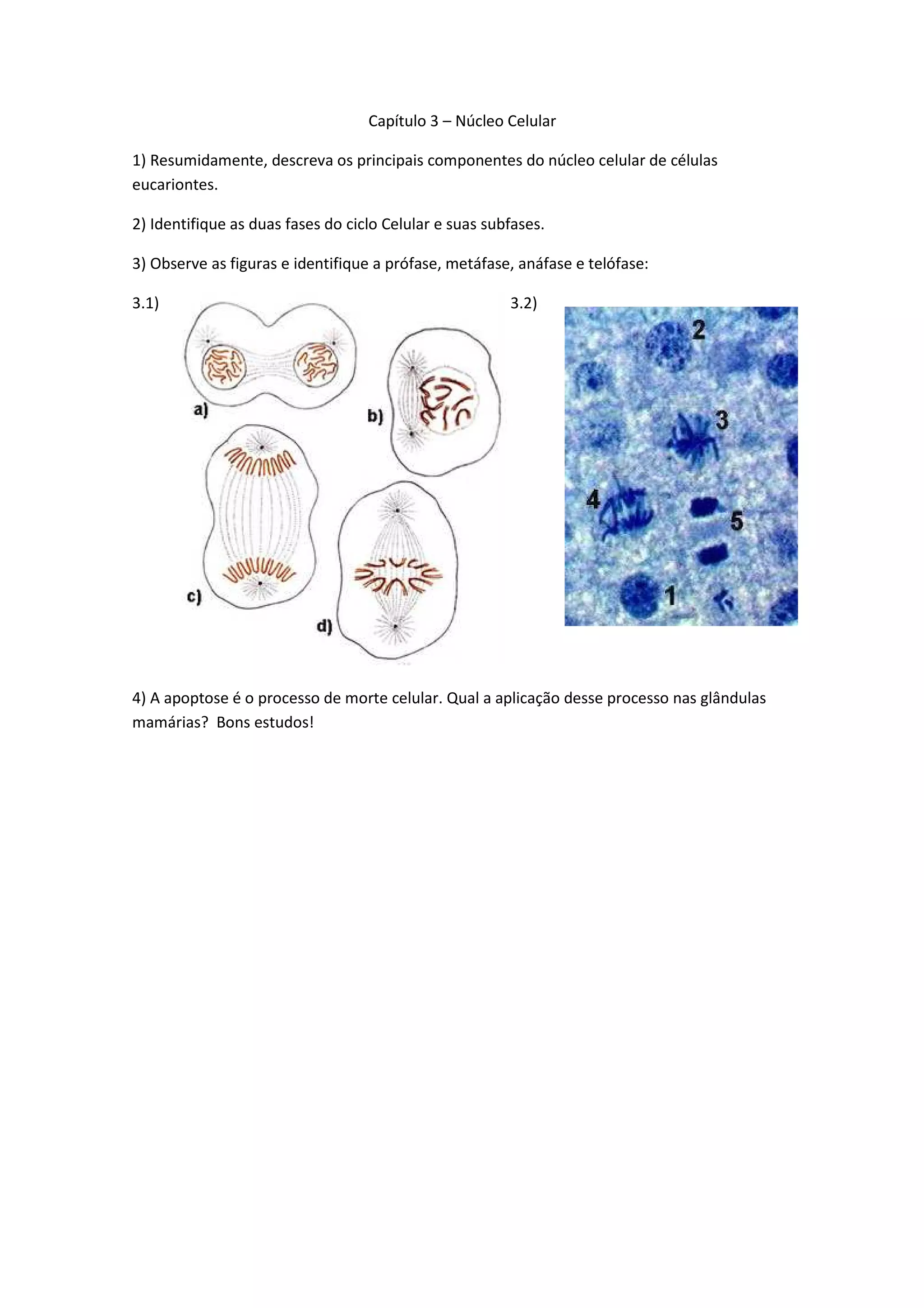 O capítulo descreve os principais componentes do núcleo celular eucariota, como o nucléolo e cromatina. Também identifica as fases do ciclo celular - interfase e mitose - e suas respectivas subfases, além de mostrar imagens ilustrando as etapas da mitose: prófase, metáfase, anáfase e telófase. Por fim, aborda a aplicação do processo de apoptose nas glândulas mamárias.