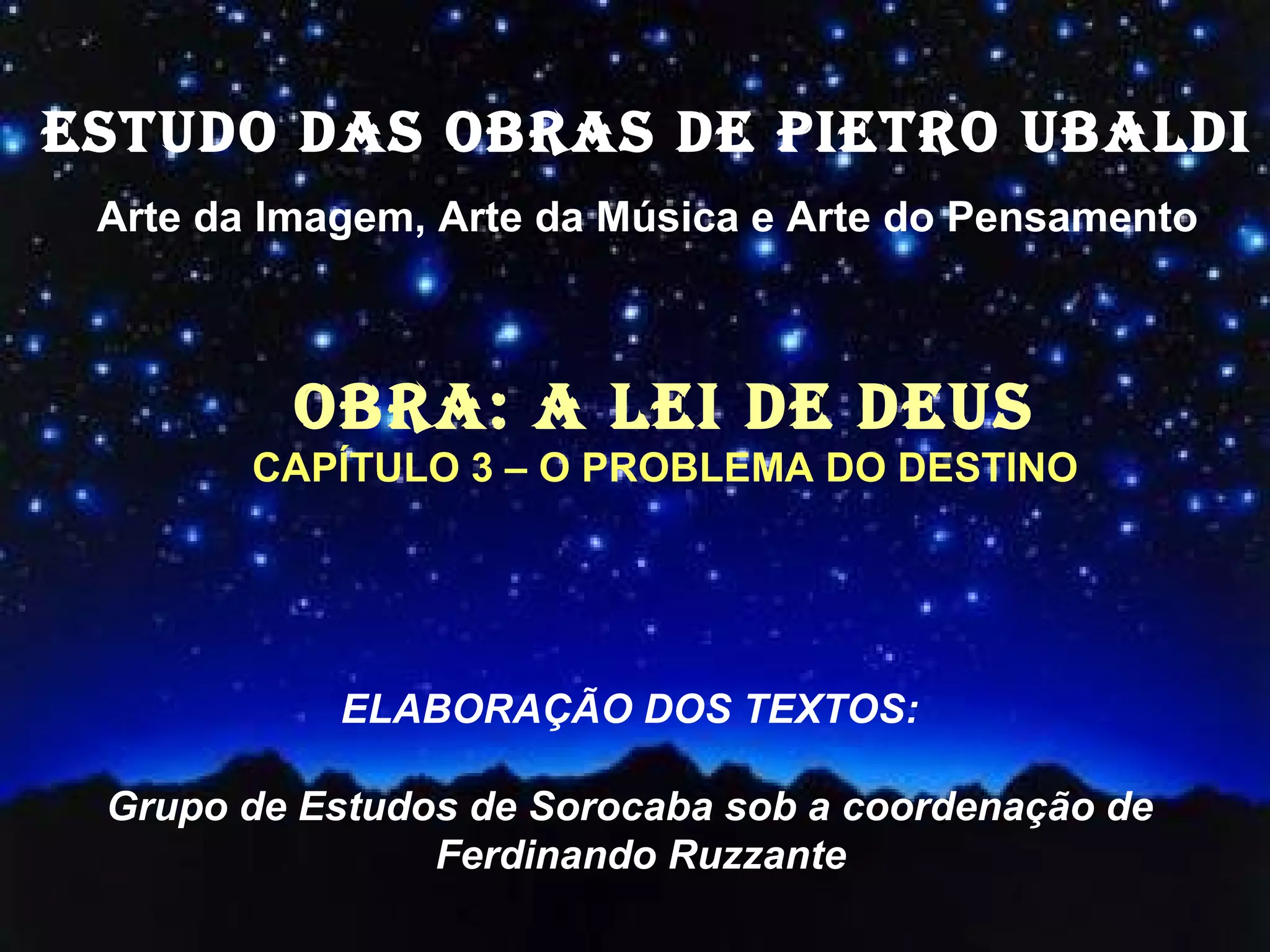 Este documento resume o capítulo 3 do livro "A Lei de Deus" de Pietro Ubaldi sobre o problema do destino. Discute que somos livres para escolher nossas ações, mas devemos aceitar as consequências delas. Também explica que a vontade de Deus se realiza através da Providência Divina, que auxilia aqueles que obedecem à Sua lei e merecem Sua proteção.