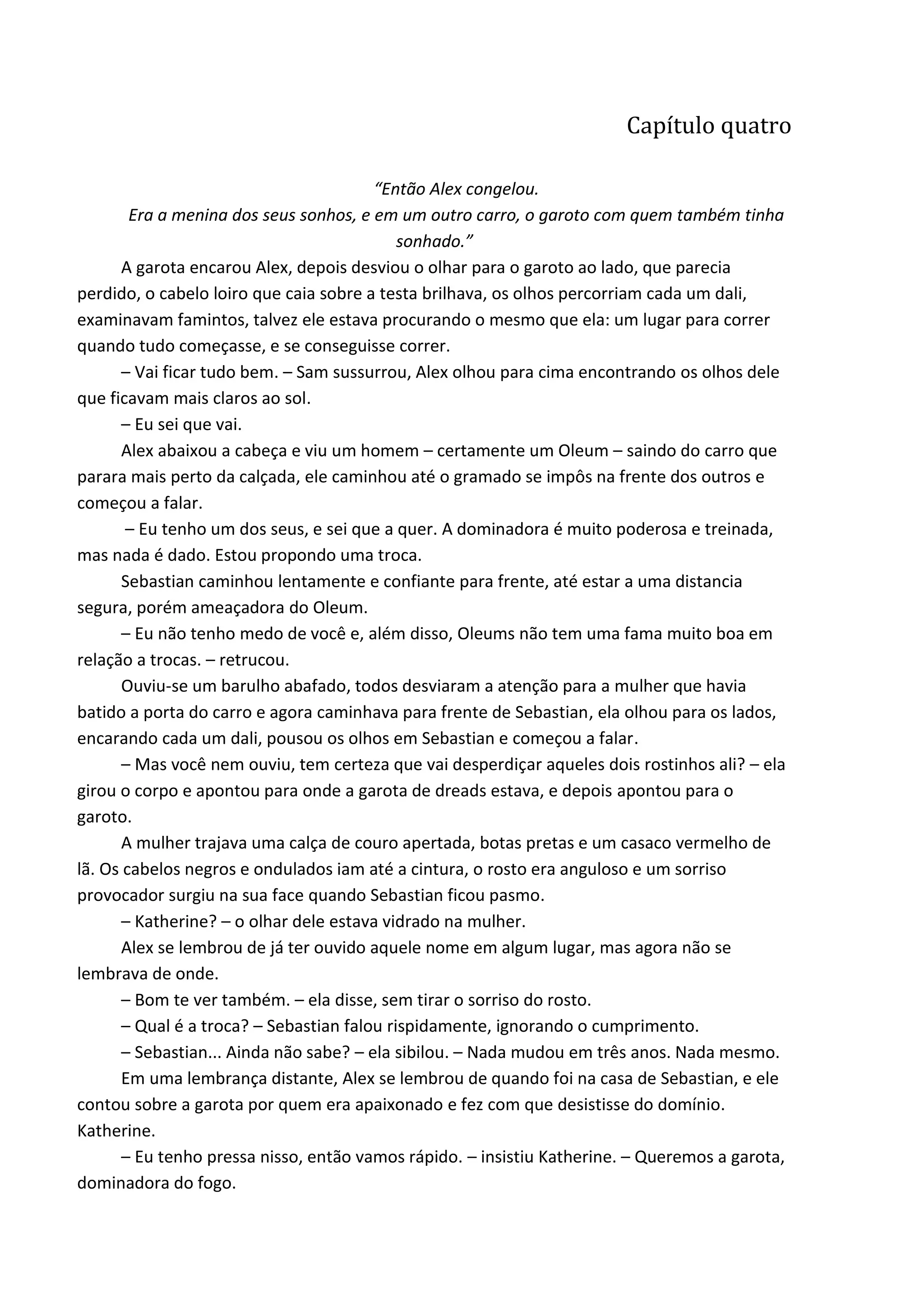 Alex encontra a garota e o garoto dos seus sonhos em uma batalha contra os Oleums. Katherine, uma inimiga de Sebastian, propõe uma troca para obter Alex, mas ele recusa. Uma luta se inicia. Alex é atacada por Katherine e quase morta, mas consegue se defender usando seu domínio sobre o fogo. Norman, o garoto dos sonhos de Alex, a encontra ferida e cuida dela.