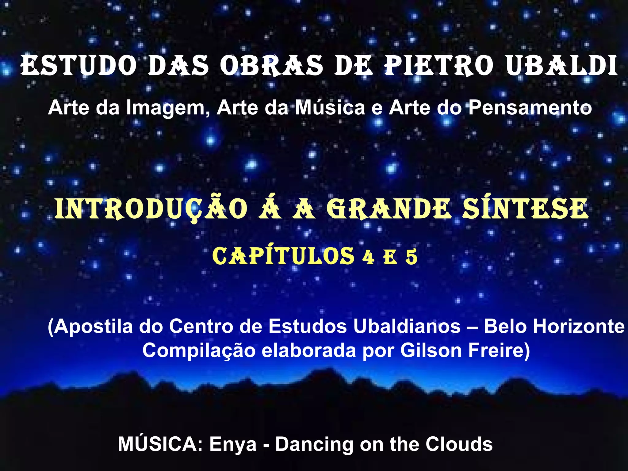O documento resume os capítulos 4 e 5 do livro "A Grande Síntese" de Pietro Ubaldi. O capítulo 4 discute a consciência profunda e superficial e como a mediunidade intuitiva emerge da consciência profunda. O capítulo 5 argumenta que as revelações divinas atuais são insuficientes e que novas revelações são necessárias para guiar a humanidade no terceiro milênio.