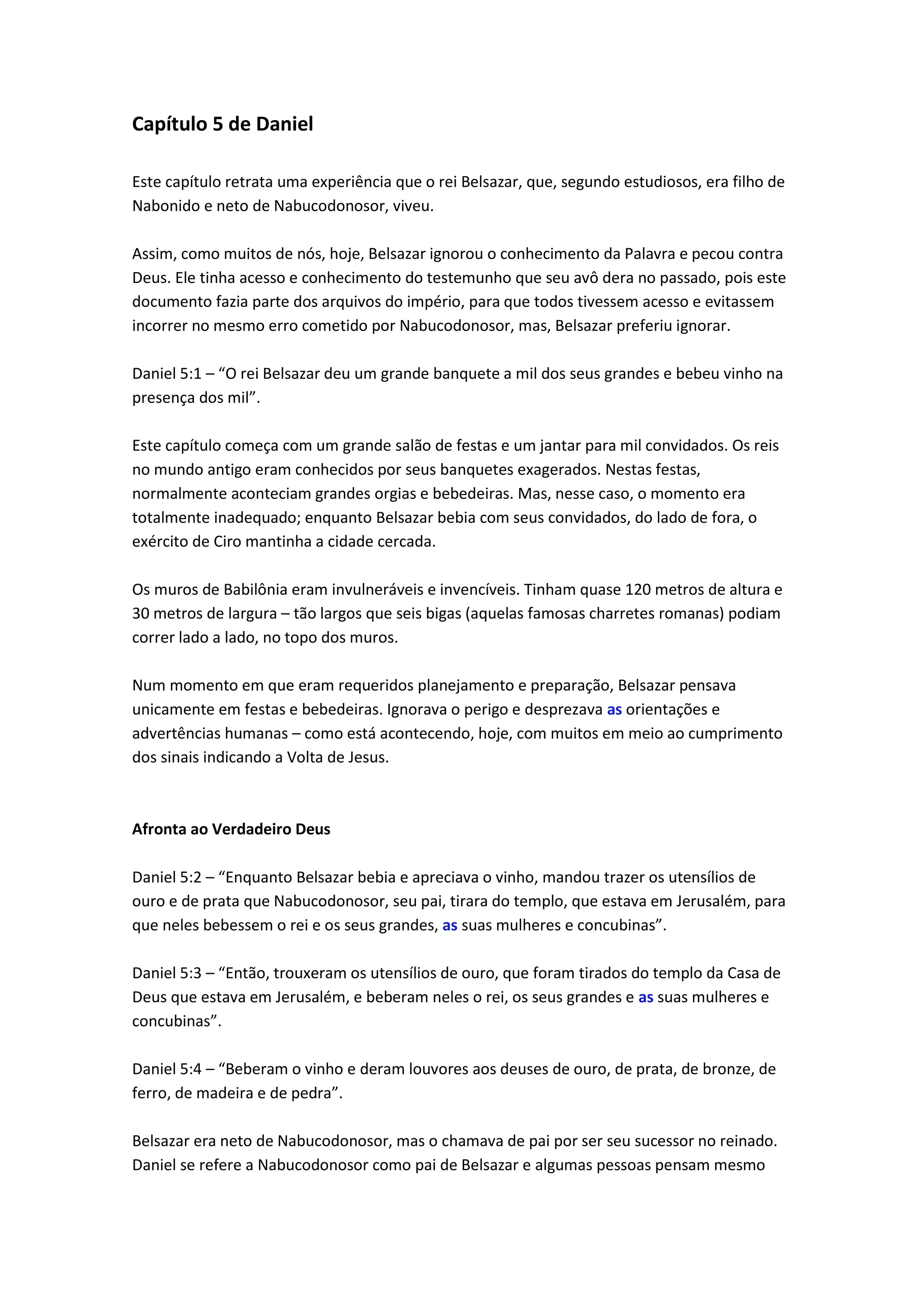 Este capítulo descreve como o rei Belsazar ignorou a Palavra de Deus e profanou objetos sagrados do templo de Jerusalém durante um banquete. Isso enfureceu Deus, que escreveu uma mensagem misteriosa na parede do palácio. Quando os sábios do rei não puderam interpretá-la, Daniel foi chamado e explicou que a mensagem anunciava o fim do reinado de Belsazar.