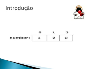 O documento discute programação com arrays em Java, abordando tópicos como: 1) declarar e criar arrays unidimensionais e multidimensionais; 2) acessar elementos de arrays; e 3) determinar o número de elementos em um array.