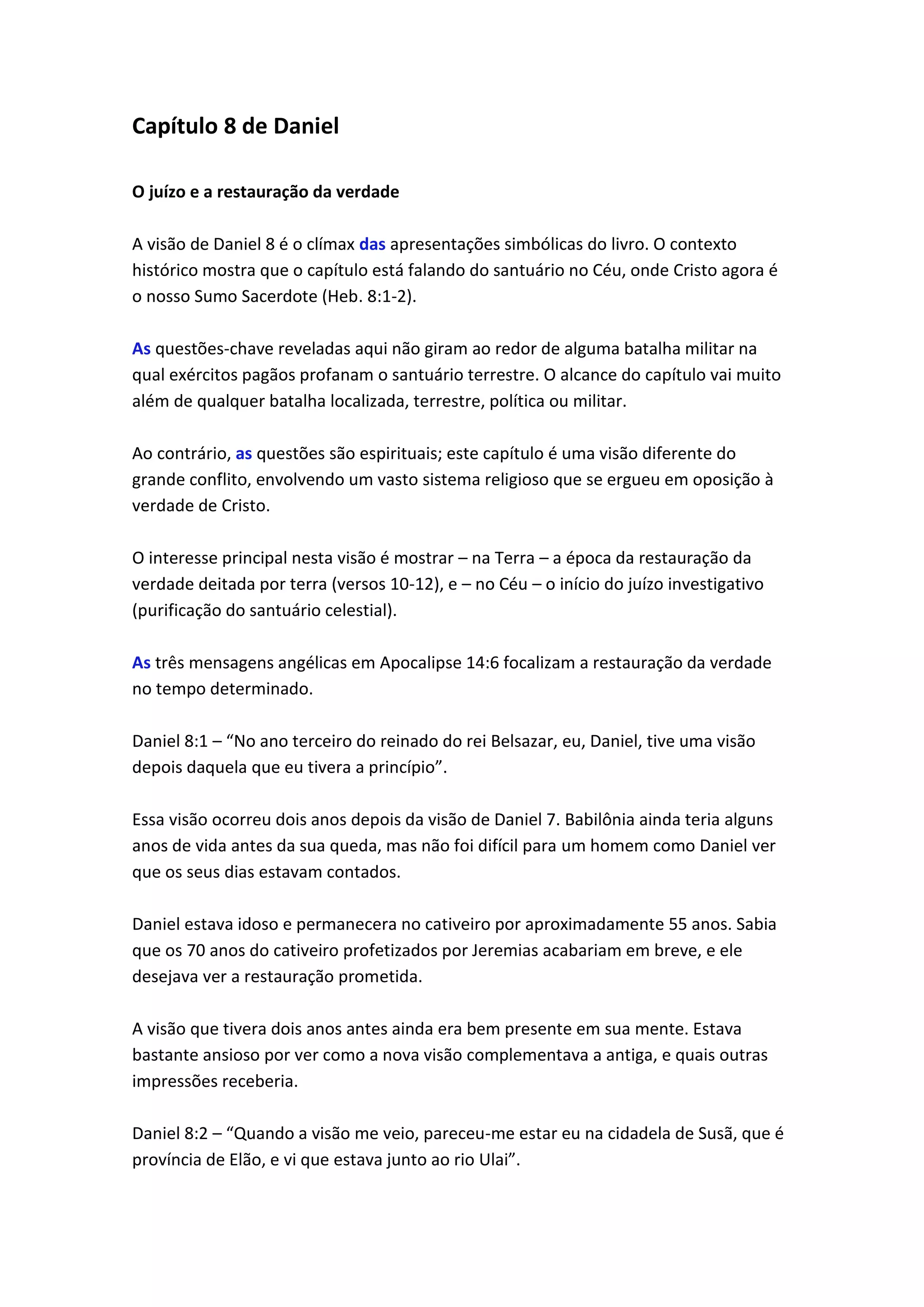 1) O capítulo descreve uma visão de Daniel sobre o conflito entre impérios representados por animais simbólicos. 2) O carneiro representa o Império Medo-Persa e o bode representa o Império Grego de Alexandre, o Grande. 3) Um chifre pequeno representa o Império Romano que destruiu o templo de Jerusalém em 70 d.C.