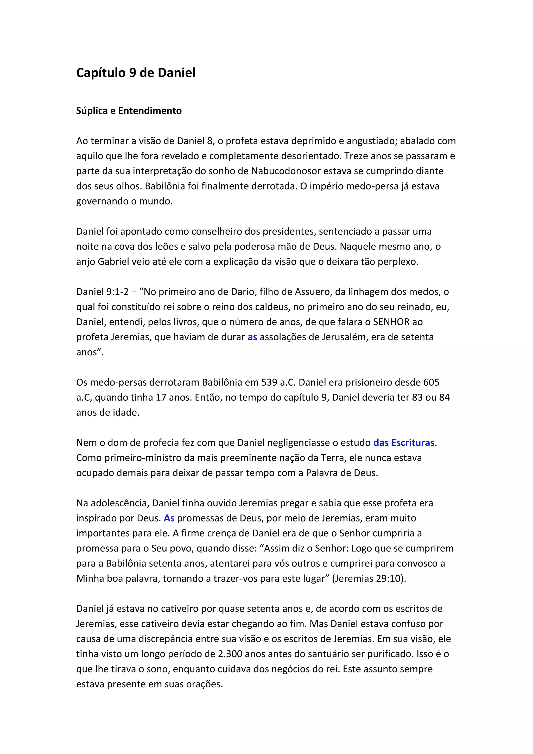 1) Daniel ora a Deus, confessando os pecados do povo de Israel e pedindo entendimento sobre a visão dos 2.300 dias;