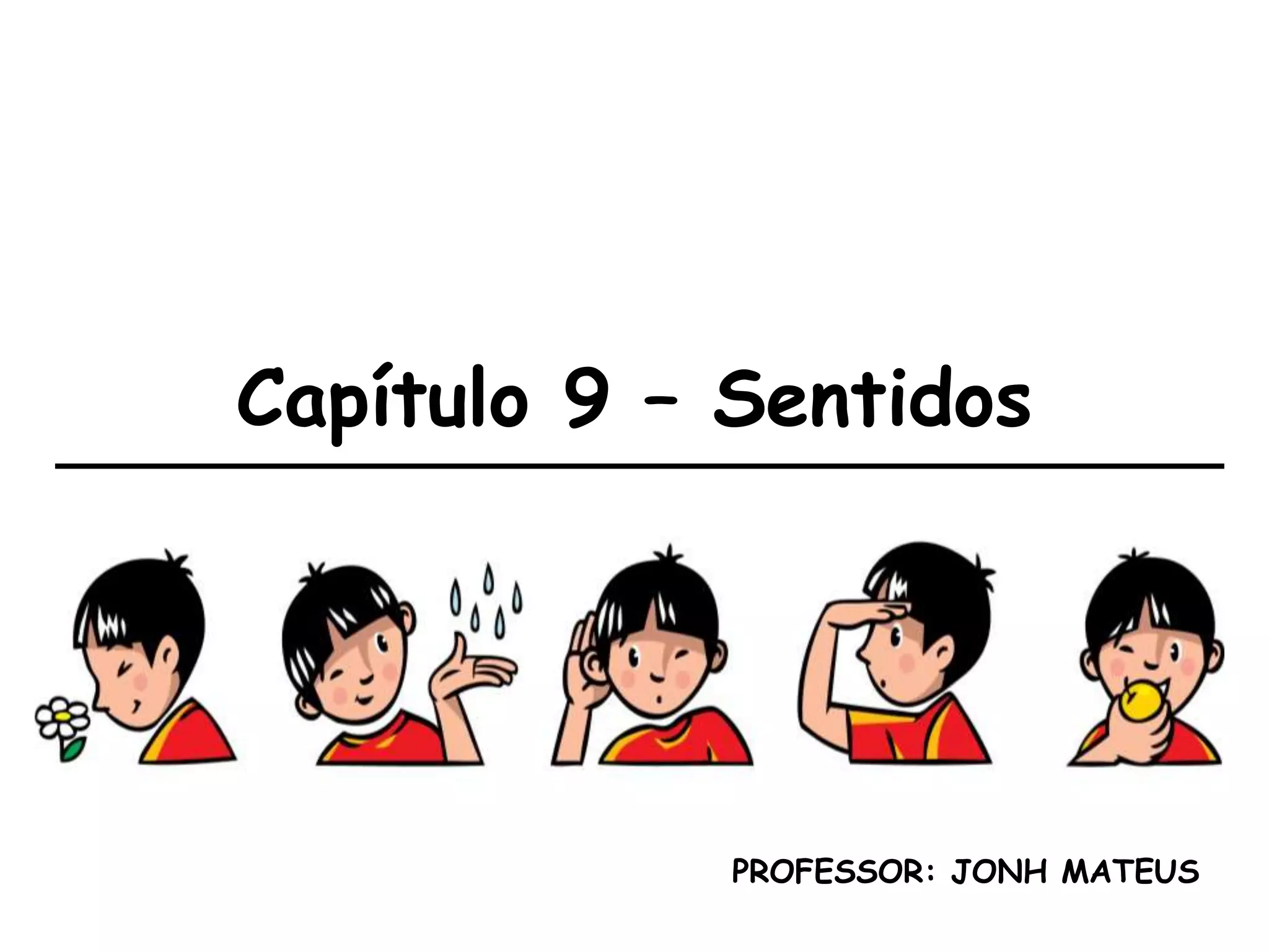 O documento descreve os cinco sentidos humanos. Ele começa explicando como o sistema sensorial capta informações do mundo exterior através de receptores. Em seguida, cada sentido é detalhado, incluindo suas estruturas, funções e possíveis problemas. Há também menção a formas inclusivas de melhorar a qualidade de vida relacionadas a cada sentido.