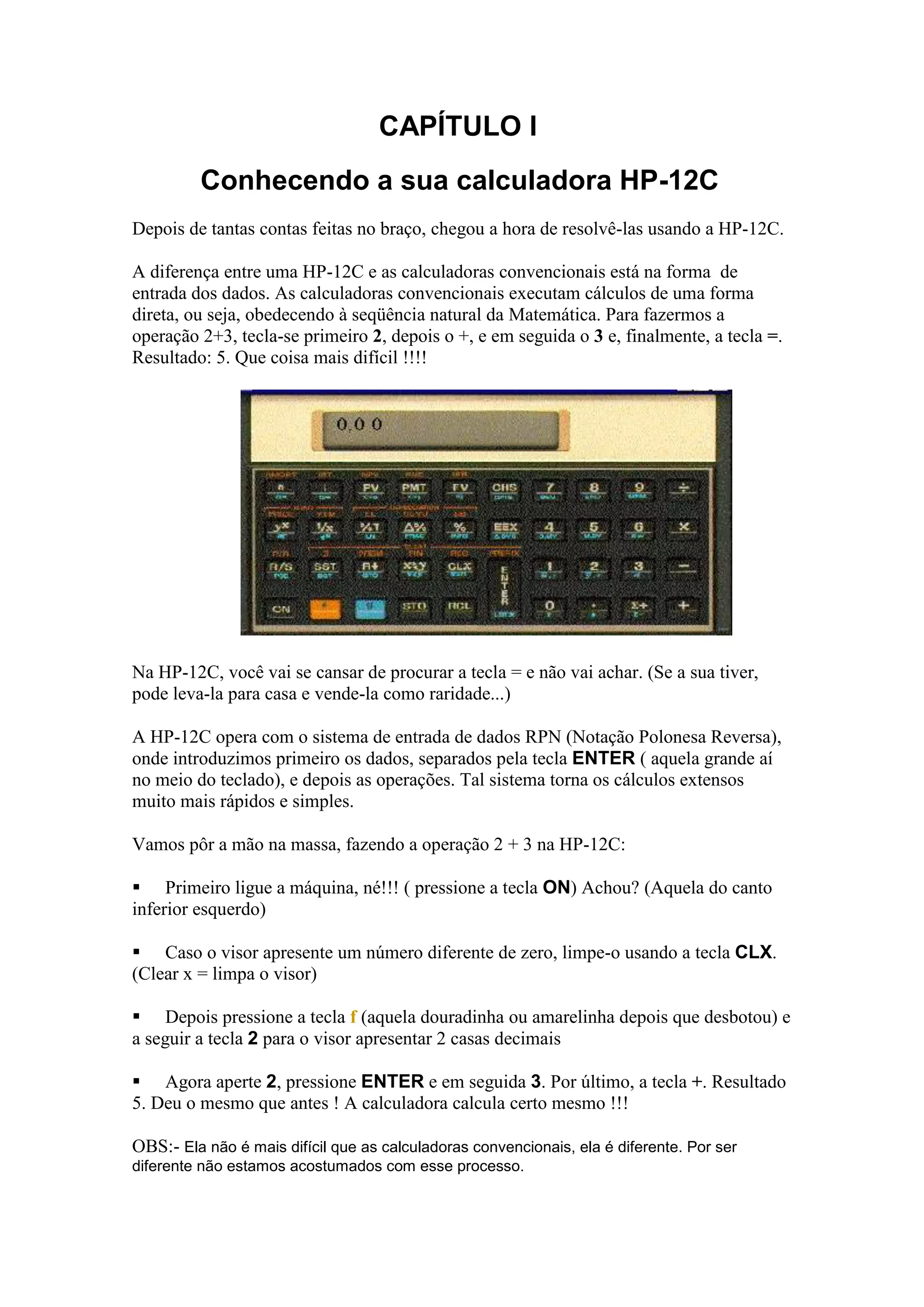 1) O documento apresenta a calculadora HP-12C e explica seu funcionamento usando a notação polonesa reversa.