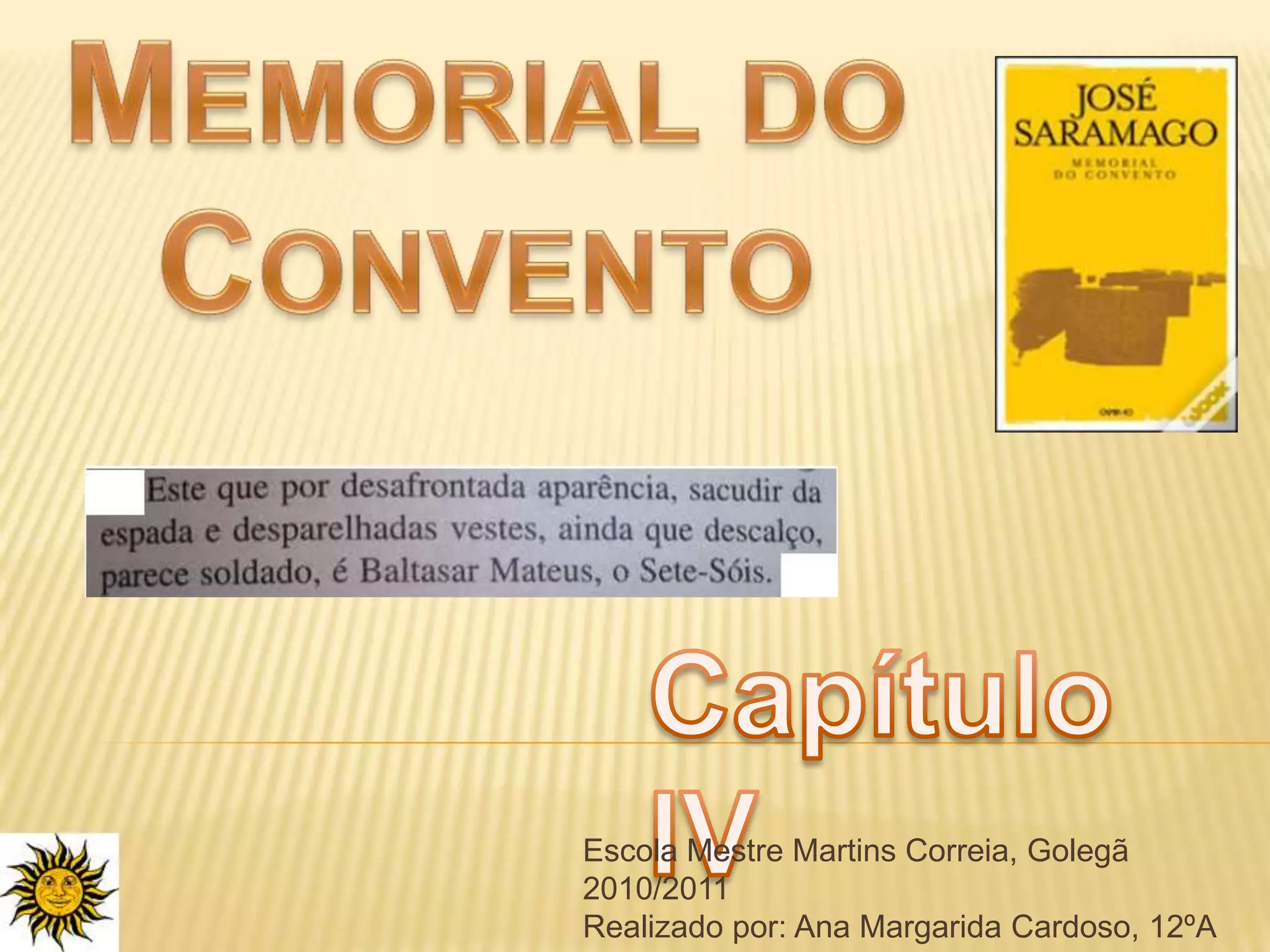 Baltasar Mateus, conhecido como Sete-Sóis, perdeu a mão esquerda na guerra em Espanha. Ele pede esmola em Évora para comprar um gancho de ferro e viaja para Lisboa, onde vive dificuldades. Ele se encontra com um amigo e ouve histórias de crimes na cidade enquanto decide se fica ou volta para sua casa.