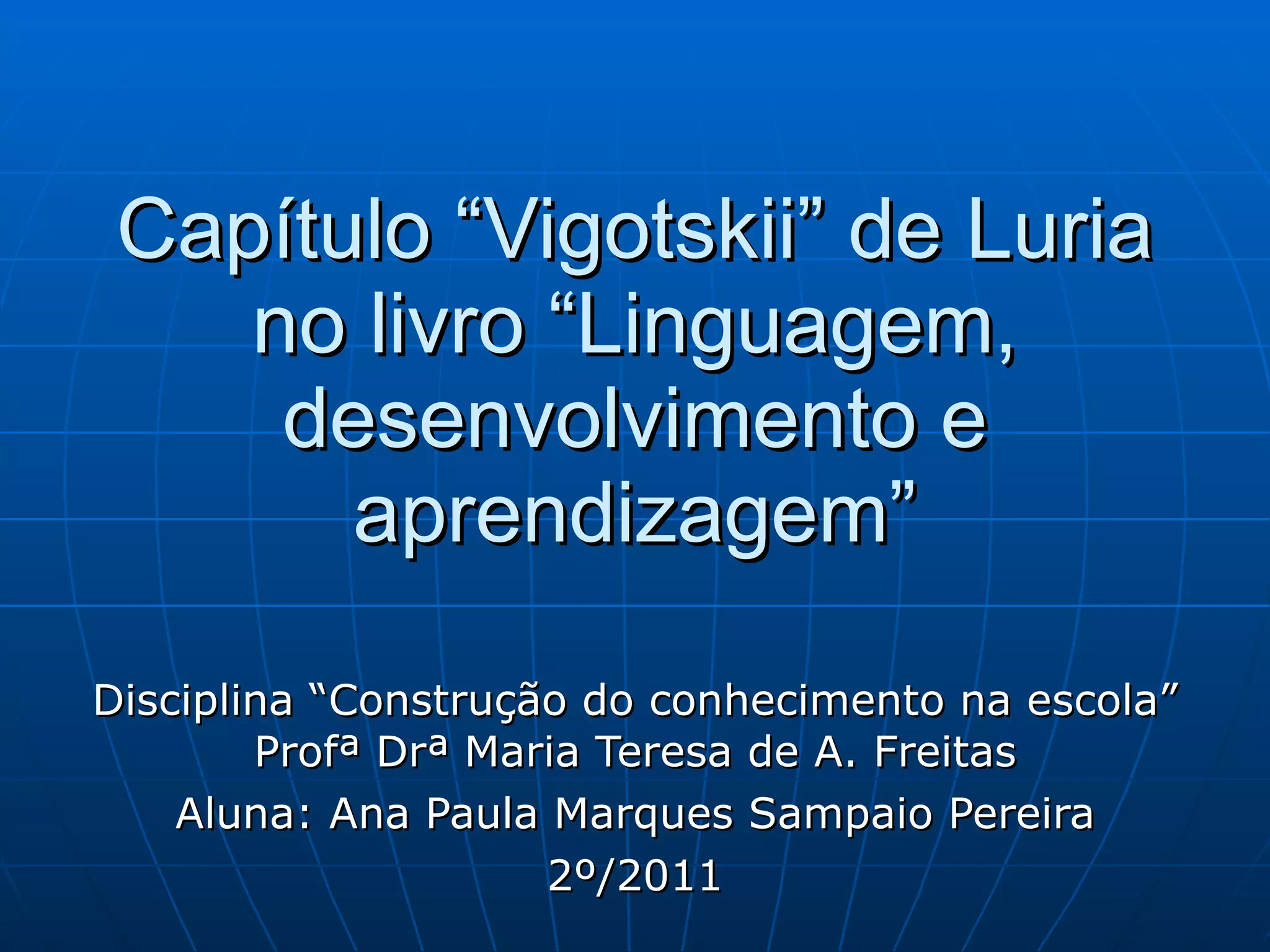 Vygotsky era um psicólogo soviético brilhante que desenvolveu uma teoria da psicologia cultural-histórica. Ele se uniu a Luria e Leontiev para formar um grupo que criticou as abordagens existentes da psicologia e propôs estudar como funções psicológicas complexas se desenvolvem através da interação de fatores biológicos e culturais, com a linguagem desempenhando um papel central. Suas ideias revolucionaram a psicologia soviética e tiveram grande influência global.