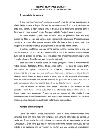 O documento discute como a perspectiva dos relacionamentos mudou para "beijar, transar e largar". Isso ocorreu devido ao secularismo, que vê Deus e a Bíblia como irrelevantes, e a ênfase na sensualidade e prazer pessoal em vez de compromisso. Como resultado, as pessoas veem os outros como descartáveis e os relacionamentos como consumíveis.