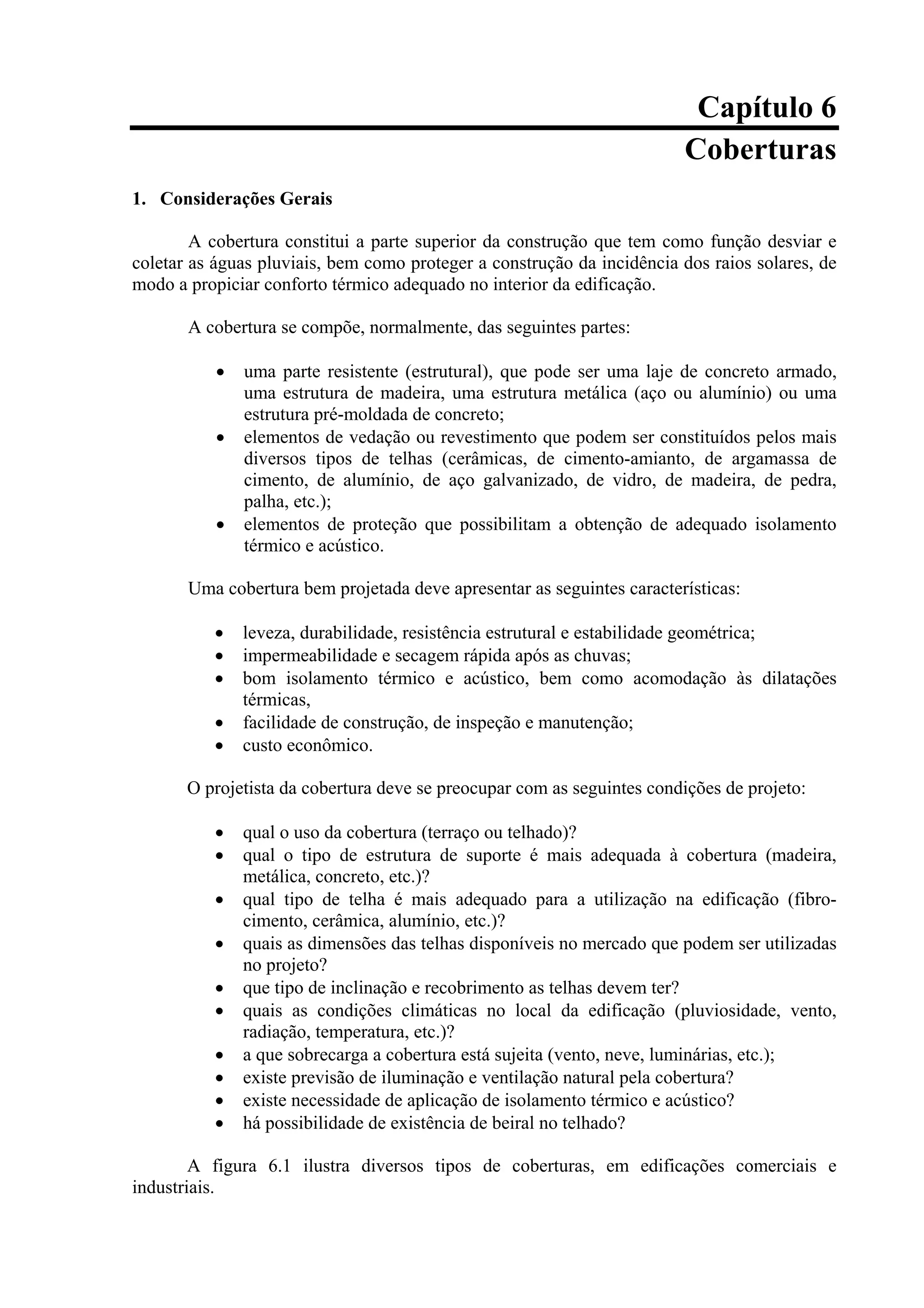 A cobertura tem como função desviar e coletar águas pluviais e proteger a construção da incidência solar. Uma boa cobertura deve ter leveza, durabilidade, isolamento térmico e custo econômico. Existem diversos tipos de telhas como cerâmicas, de fibro-cimento e metálicas, que variam em forma, dimensão e inclinação adequada.