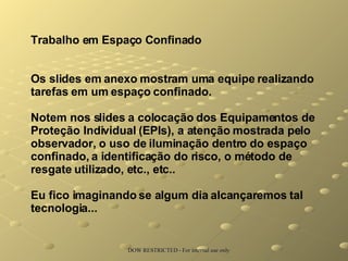 O documento descreve uma equipe realizando trabalho em um espaço confinado, mostrando a correta colocação dos EPIs, a atenção do observador, iluminação no espaço, identificação de riscos e o método de resgate utilizado.