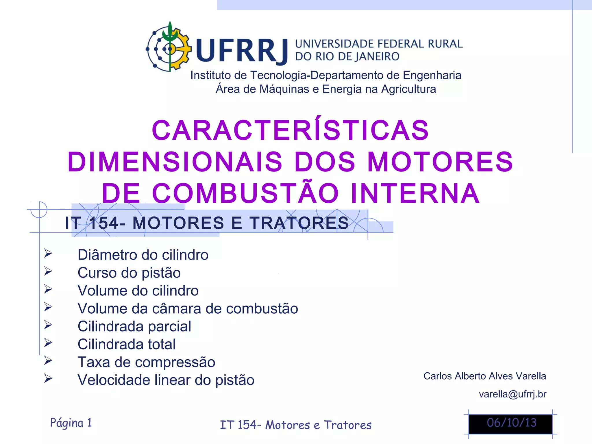 CARACTERÍSTICAS DIMENSIONAIS DOS MOTORES DECOMBUSTÃO INTERNA  Diâmetro do cilindro  Curso do pistão  Volume do cilindro  Volume da câmara de combustão  Cilindrada parcial  Cilindrada total  Taxa de compressão  Velocidade linear do pistão IT 154- MOTORES E TRATORES Instituto de Tecnologia-Departamento de Engenharia Área de Máquinas e Energia na Agricultura Carlos Alberto Alves Varella varella@ufrrj.br 06/10/13IT 154- Motores e TratoresPágina 1