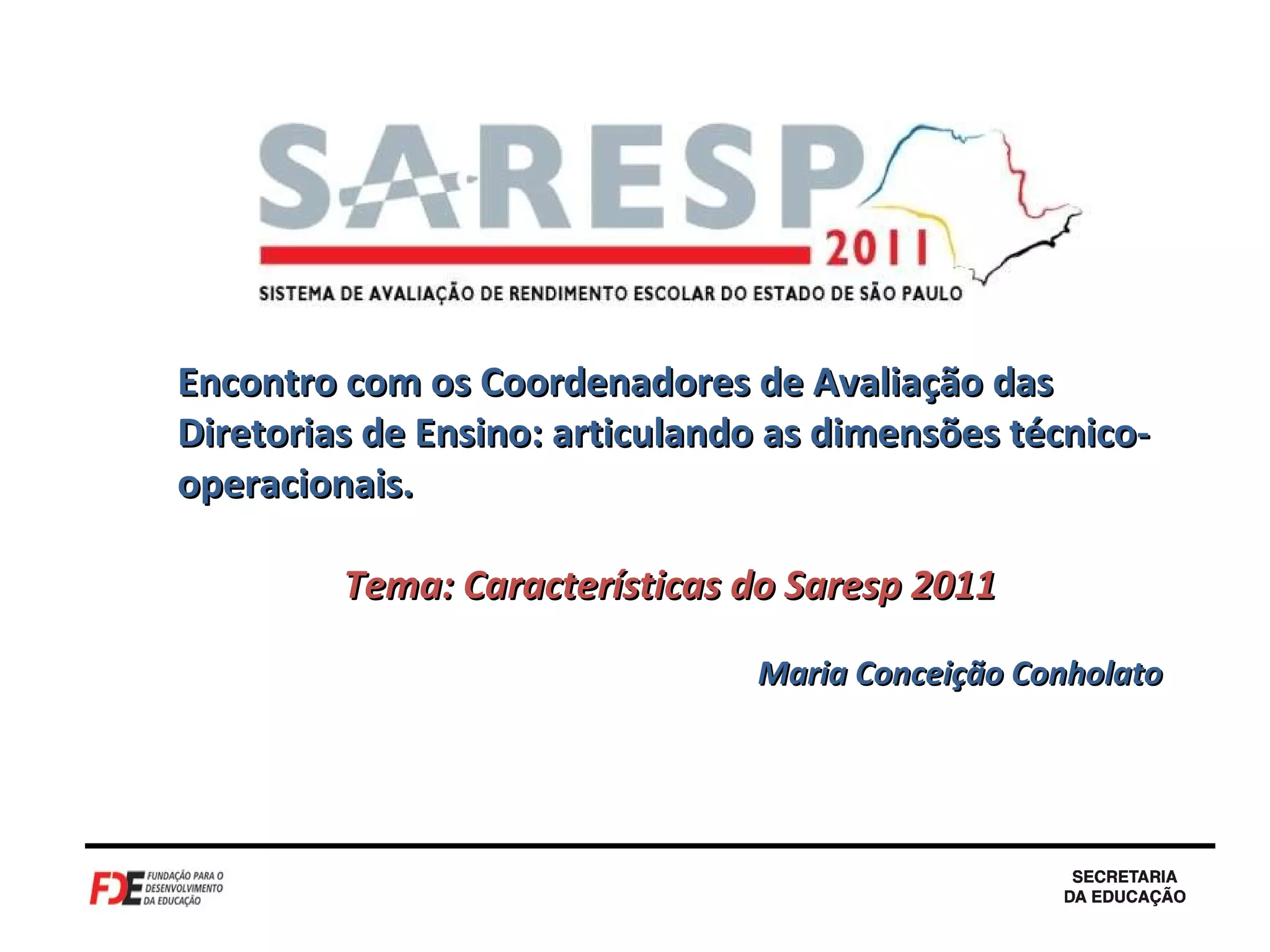 O documento descreve as características e procedimentos da avaliação Saresp 2011, incluindo os instrumentos de avaliação, questionários, calendário e logística. As provas avaliarão Língua Portuguesa, Matemática e outras disciplinas em escolas públicas e adesão. Questionários coletarão dados sobre alunos, pais e escolas.