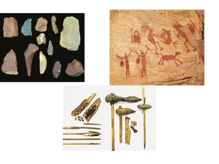 O documento apresenta um resumo sobre a pré-história dividida em três fases: Paleolítico, Neolítico e Idade dos Metais. O Paleolítico foi marcado por caçadores-coletores nômades. No Neolítico houve o desenvolvimento da agricultura, domesticação de animais e sedentarização. A Idade dos Metais introduziu o uso do cobre e outros metais para ferramentas.