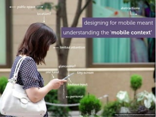 Este documento discute as diferenças entre o desenvolvimento de aplicativos móveis, web e desktop. Apresenta os desafios do hardware limitado de dispositivos móveis e as expectativas dos usuários. Também compara os modelos de estado, atualização e compatibilidade entre plataformas móvel, web e desktop.