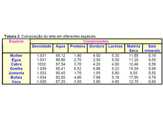 O documento descreve as principais características do leite, incluindo sua classificação, composição nutricional, características organolépticas, densidade e requisitos higiênicos. O leite é classificado de acordo com seu modo de produção e contagem de microrganismos em categorias A, B ou C. Ele fornece nutrientes essenciais como proteínas, lipídios e vitaminas.