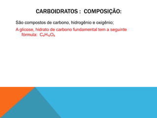 Os carboidratos são compostos de carbono, hidrogênio e oxigênio que fornecem a principal fonte de energia para o corpo. Eles incluem monossacarídeos como glicose e frutose, dissacarídeos como sacarose e lactose, e polissacarídeos como amido e celulose. Os carboidratos complexos fornecem energia de forma gradual ao contrário dos simples que causam picos de glicemia.