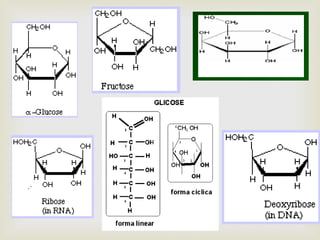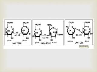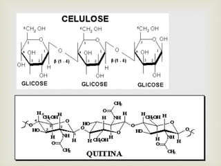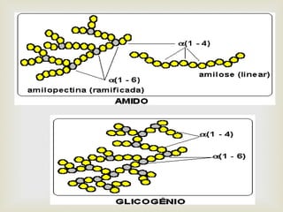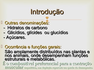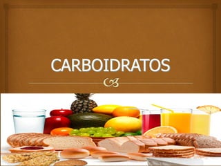 O documento fornece informações sobre carboidratos, incluindo suas definições, classificações, funções e digestão. Carboidratos são compostos por carbono, hidrogênio e oxigênio que desempenham papéis estruturais e metabólicos. Eles incluem monossacarídeos, dissacarídeos e polissacarídeos e fornecem a principal fonte de energia para os seres vivos.