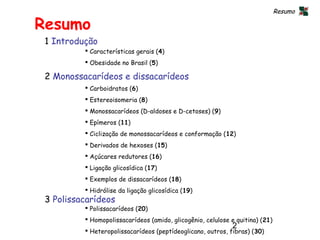 O documento resume os principais tipos de carboidratos, incluindo monossacarídeos, dissacarídeos e polissacarídeos. Detalha as estruturas dos açúcares mais comuns como glicose, frutose e sacarose, assim como polissacarídeos de armazenamento como amido e glicogênio e polissacarídeos estruturais como celulose. Discutem-se também heteropolissacarídeos encontrados em plantas e microrganismos.